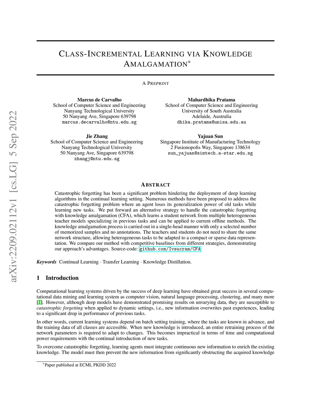 Catastrophic forgetting has been a significant problem hindering the deployment of deep learning algorithms in the continual learning setting. Numerous methods have been proposed to address the catastrophic forgetting problem where an agent loses its generalization power of old tasks while learning new tasks. We put forward an alternative strategy to handle the catastrophic forgetting with knowledge amalgamation (CFA), which learns a student network from multiple heterogeneous teacher models specializing in previous tasks and can be applied to current offline methods. The knowledge amalgamation process is carried out in a single-head manner with only a selected number of memorized samples and no annotations. The teachers and students do not need to share the same network structure, allowing heterogeneous tasks to be adapted to a compact or sparse data representation. We compare our method with competitive baselines from different strategies, demonstrating our approach's advantages.