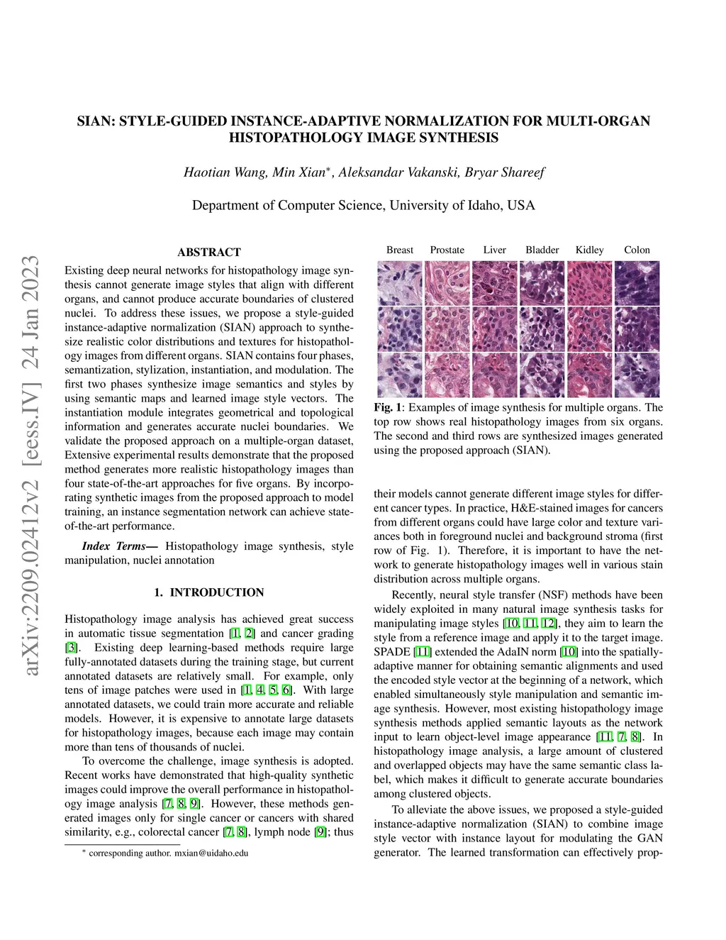Existing deep neural networks for histopathology image synthesis cannot generate image styles that align with different organs, and cannot produce accurate boundaries of clustered nuclei. To address these issues, we propose a style-guided instance-adaptive normalization (SIAN) approach to synthesize realistic color distributions and textures for histopathology images from different organs. SIAN contains four phases, semantization, stylization, instantiation, and modulation. The first two phases synthesize image semantics and styles by using semantic maps and learned image style vectors. The instantiation module integrates geometrical and topological information and generates accurate nuclei boundaries. We validate the proposed approach on a multiple-organ dataset, Extensive experimental results demonstrate that the proposed method generates more realistic histopathology images than four state-of-the-art approaches for five organs. By incorporating synthetic images from the proposed approach to model training, an instance segmentation network can achieve state-of-the-art performance.