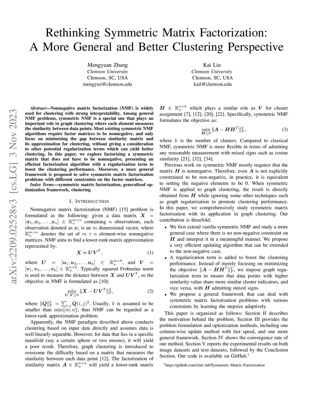 Nonnegative matrix factorization (NMF) is widely used for clustering with strong interpretability. Among general NMF problems, symmetric NMF is a special one that plays an important role in graph clustering where each element measures the similarity between data points. Most existing symmetric NMF algorithms require factor matrices to be nonnegative, and only focus on minimizing the gap between similarity matrix and its approximation for clustering, without giving a consideration to other potential regularization terms which can yield better clustering. In this paper, we explore factorizing a symmetric matrix that does not have to be nonnegative, presenting an efficient factorization algorithm with a regularization term to boost the clustering performance. Moreover, a more general framework is proposed to solve symmetric matrix factorization problems with different constraints on the factor matrices.