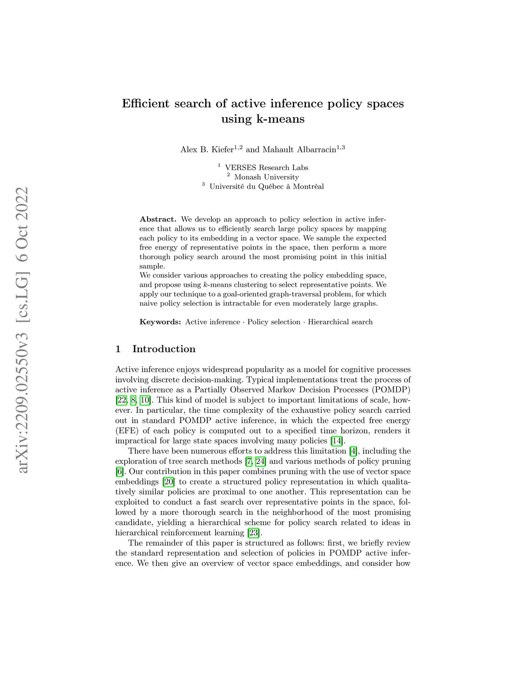 Efficient search of active inference policy spaces using k-means