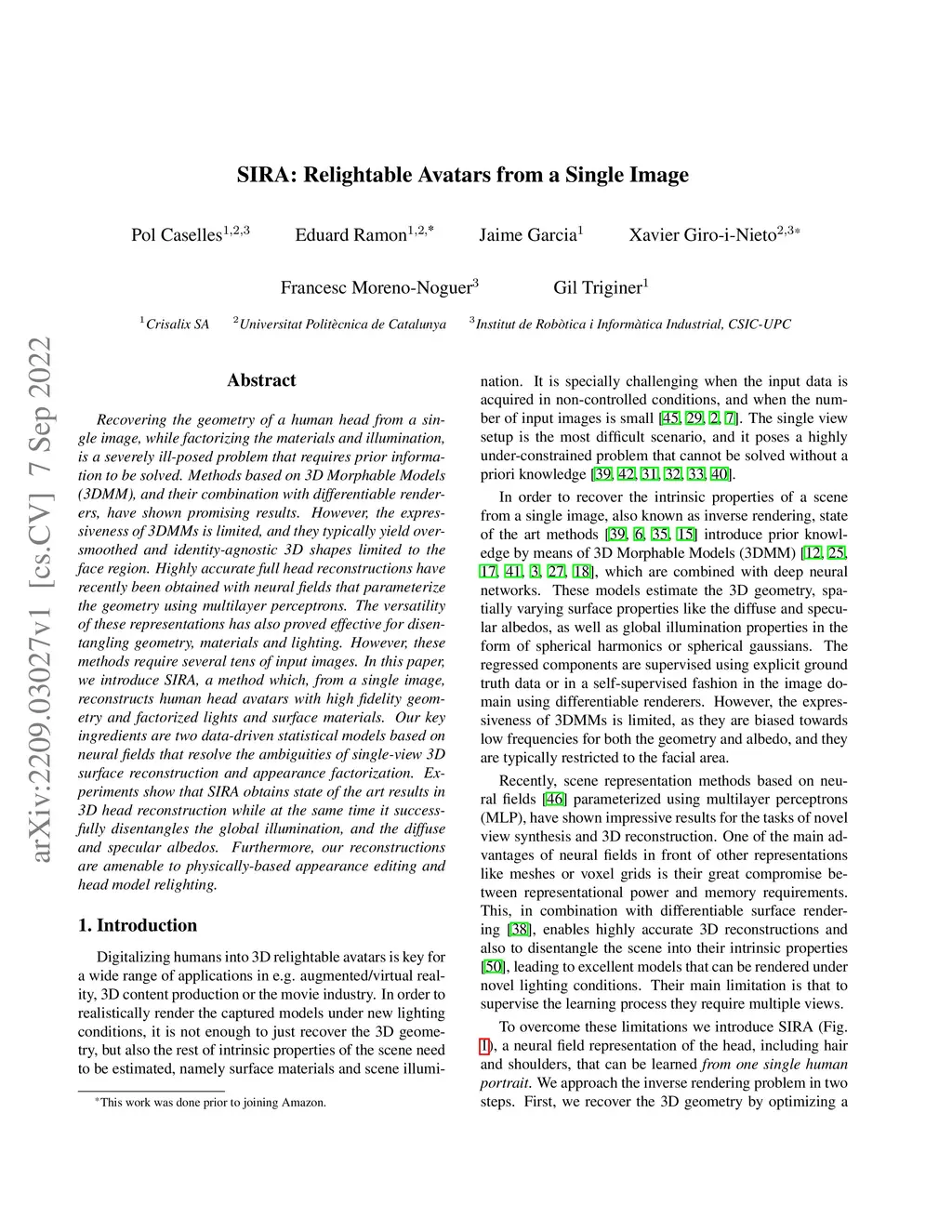 Recovering the geometry of a human head from a single image, while factorizing the materials and illumination is a severely ill-posed problem that requires prior information to be solved. Methods based on 3D Morphable Models (3DMM), and their combination with differentiable renderers, have shown promising results. However, the expressiveness of 3DMMs is limited, and they typically yield over-smoothed and identity-agnostic 3D shapes limited to the face region. Highly accurate full head reconstructions have recently been obtained with neural fields that parameterize the geometry using multilayer perceptrons. The versatility of these representations has also proved effective for disentangling geometry, materials and lighting. However, these methods require several tens of input images. In this paper, we introduce SIRA, a method which, from a single image, reconstructs human head avatars with high fidelity geometry and factorized lights and surface materials. Our key ingredients are two data-driven statistical models based on neural fields that resolve the ambiguities of single-view 3D surface reconstruction and appearance factorization. Experiments show that SIRA obtains state of the art results in 3D head reconstruction while at the same time it successfully disentangles the global illumination, and the diffuse and specular albedos. Furthermore, our reconstructions are amenable to physically-based appearance editing and head model relighting.