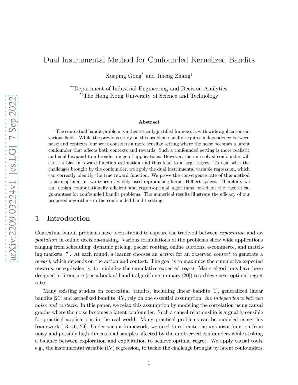 The contextual bandit problem is a theoretically justified framework with wide applications in various fields. While the previous study on this problem usually requires independence between noise and contexts, our work considers a more sensible setting where the noise becomes a latent confounder that affects both contexts and rewards. Such a confounded setting is more realistic and could expand to a broader range of applications. However, the unresolved confounder will cause a bias in reward function estimation and thus lead to a large regret. To deal with the challenges brought by the confounder, we apply the dual instrumental variable regression, which can correctly identify the true reward function. We prove the convergence rate of this method is near-optimal in two types of widely used reproducing kernel Hilbert spaces. Therefore, we can design computationally efficient and regret-optimal algorithms based on the theoretical guarantees for confounded bandit problems. The numerical results illustrate the efficacy of our proposed algorithms in the confounded bandit setting.