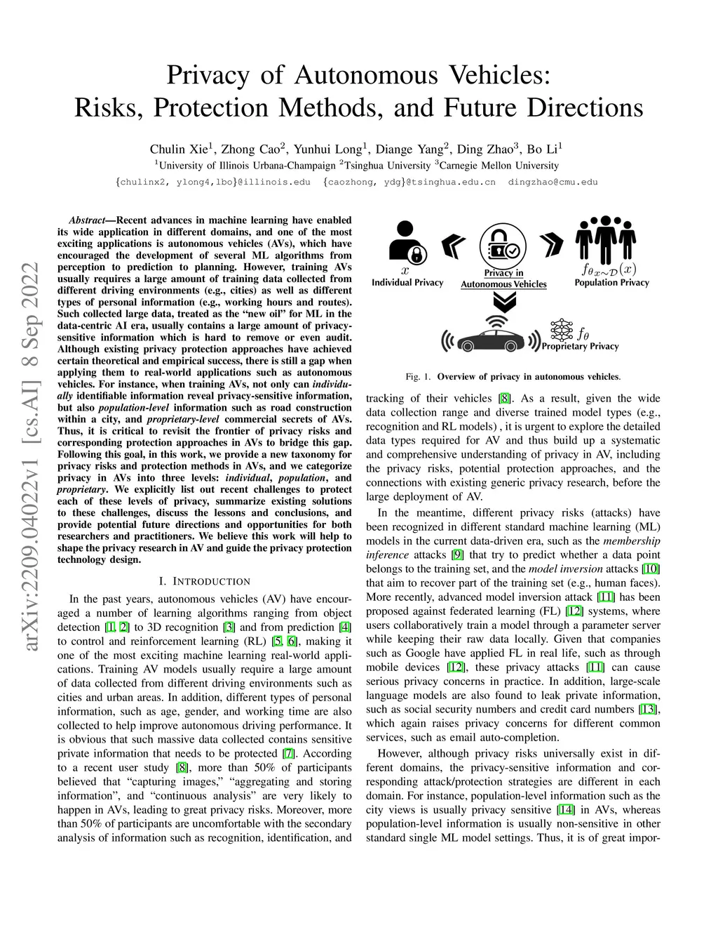 Recent advances in machine learning have enabled its wide application in different domains, and one of the most exciting applications is autonomous vehicles (AVs), which have encouraged the development of a number of ML algorithms from perception to prediction to planning. However, training AVs usually requires a large amount of training data collected from different driving environments (e.g., cities) as well as different types of personal information (e.g., working hours and routes). Such collected large data, treated as the new oil for ML in the data-centric AI era, usually contains a large amount of privacy-sensitive information which is hard to remove or even audit. Although existing privacy protection approaches have achieved certain theoretical and empirical success, there is still a gap when applying them to real-world applications such as autonomous vehicles. For instance, when training AVs, not only can individually identifiable information reveal privacy-sensitive information, but also population-level information such as road construction within a city, and proprietary-level commercial secrets of AVs. Thus, it is critical to revisit the frontier of privacy risks and corresponding protection approaches in AVs to bridge this gap. Following this goal, in this work, we provide a new taxonomy for privacy risks and protection methods in AVs, and we categorize privacy in AVs into three levels: individual, population, and proprietary. We explicitly list out recent challenges to protect each of these levels of privacy, summarize existing solutions to these challenges, discuss the lessons and conclusions, and provide potential future directions and opportunities for both researchers and practitioners. We believe this work will help to shape the privacy research in AV and guide the privacy protection technology design.