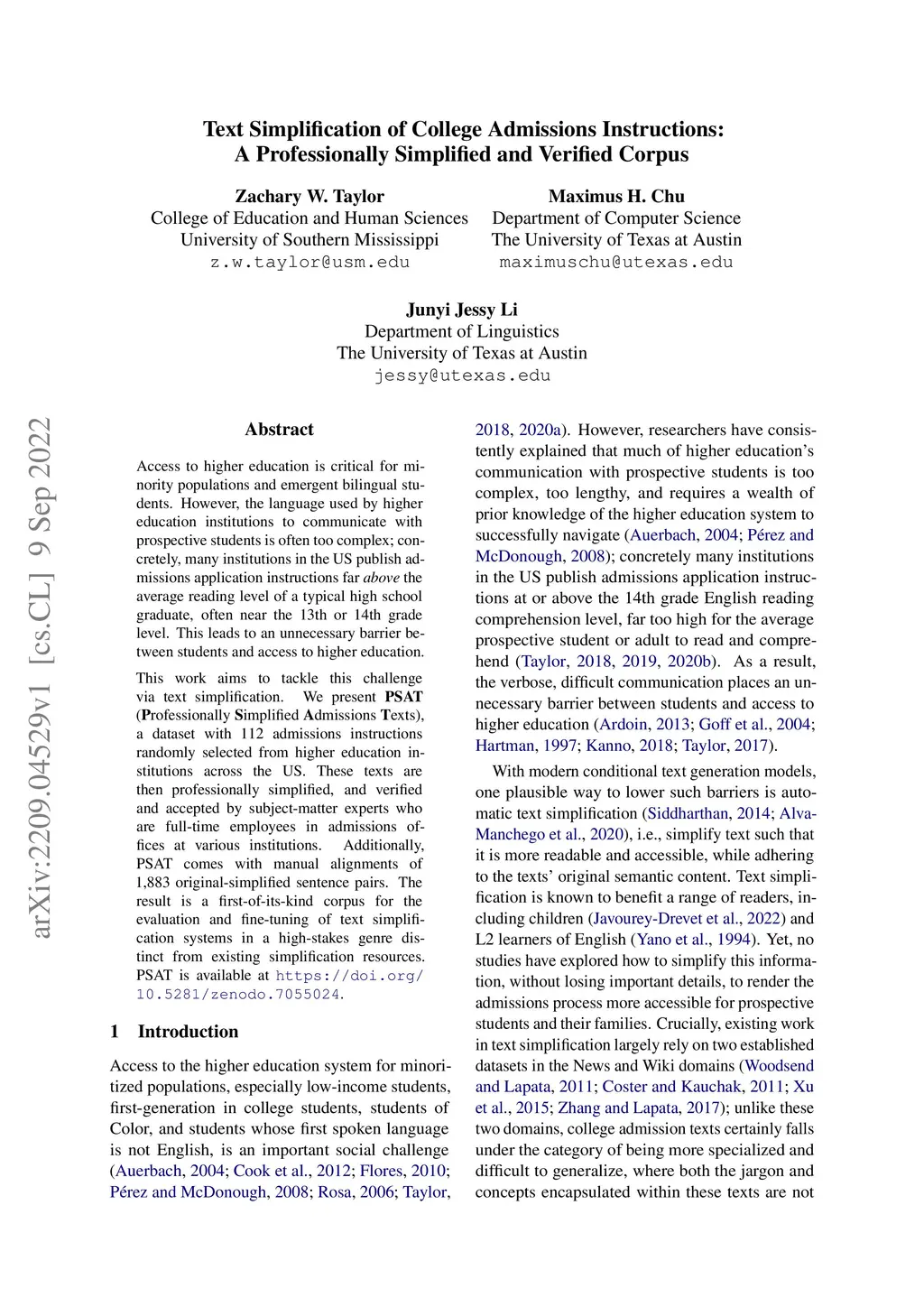 Access to higher education is critical for minority populations and emergent bilingual students. However, the language used by higher education institutions to communicate with prospective students is often too complex; concretely, many institutions in the US publish admissions application instructions far above the average reading level of a typical high school graduate, often near the 13th or 14th grade level. This leads to an unnecessary barrier between students and access to higher education. This work aims to tackle this challenge via text simplification. We present PSAT (Professionally Simplified Admissions Texts), a dataset with 112 admissions instructions randomly selected from higher education institutions across the US. These texts are then professionally simplified, and verified and accepted by subject-matter experts who are full-time employees in admissions offices at various institutions. Additionally, PSAT comes with manual alignments of 1,883 original-simplified sentence pairs. The result is a first-of-its-kind corpus for the evaluation and fine-tuning of text simplification systems in a high-stakes genre distinct from existing simplification resources.