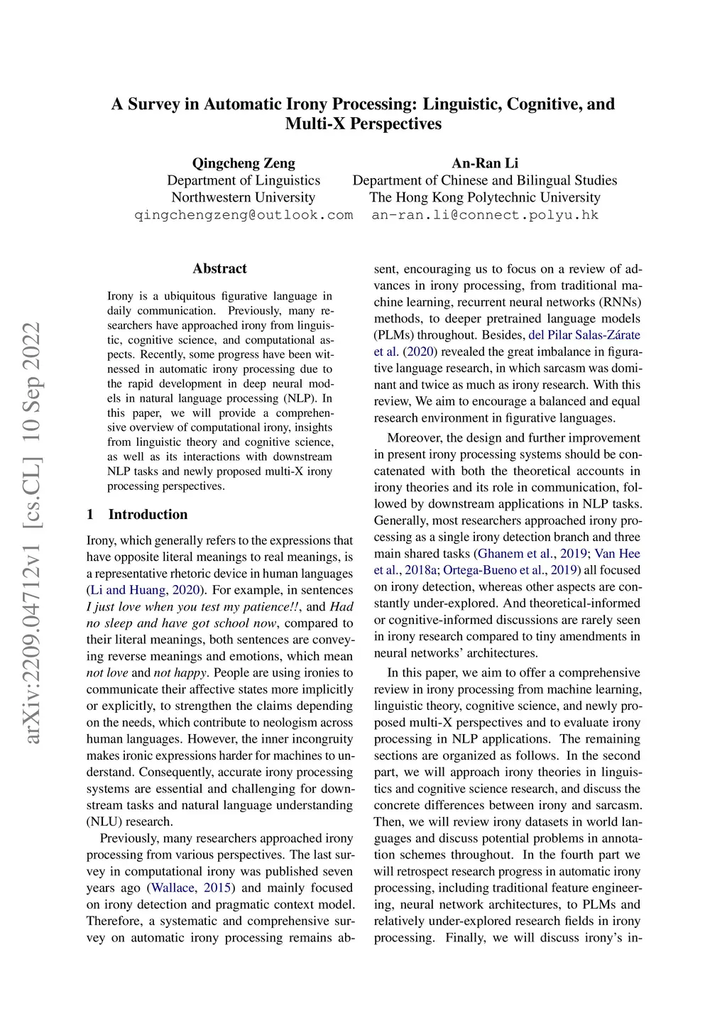 Irony is a ubiquitous figurative language in daily communication. Previously, many researchers have approached irony from linguistic, cognitive science, and computational aspects. Recently, some progress have been witnessed in automatic irony processing due to the rapid development in deep neural models in natural language processing (NLP). In this paper, we will provide a comprehensive overview of computational irony, insights from linguistic theory and cognitive science, as well as its interactions with downstream NLP tasks and newly proposed multi-X irony processing perspectives.
