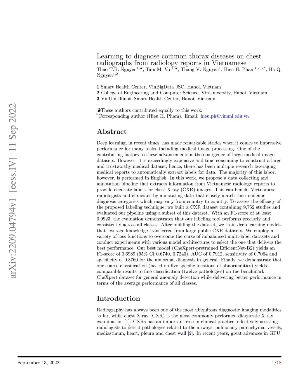 We propose a data collecting and annotation pipeline that extracts information from Vietnamese radiology reports to provide accurate labels for chest X-ray (CXR) images. This can benefit Vietnamese radiologists and clinicians by annotating data that closely match their endemic diagnosis categories which may vary from country to country. To assess the efficacy of the proposed labeling technique, we built a CXR dataset containing 9,752 studies and evaluated our pipeline using a subset of this dataset. With an F1-score of at least 0.9923, the evaluation demonstrates that our labeling tool performs precisely and consistently across all classes. After building the dataset, we train deep learning models that leverage knowledge transferred from large public CXR datasets. We employ a variety of loss functions to overcome the curse of imbalanced multi-label datasets and conduct experiments with various model architectures to select the one that delivers the best performance. Our best model (CheXpert-pretrained EfficientNet-B2) yields an F1-score of 0.6989 (95% CI 0.6740, 0.7240), AUC of 0.7912, sensitivity of 0.7064 and specificity of 0.8760 for the abnormal diagnosis in general. Finally, we demonstrate that our coarse classification (based on five specific locations of abnormalities) yields comparable results to fine classification (twelve pathologies) on the benchmark CheXpert dataset for general anomaly detection while delivering better performance in terms of the average performance of all classes.
