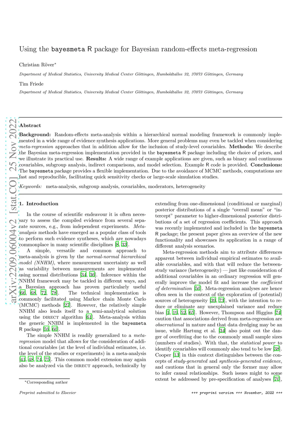 BACKGROUND: Random-effects meta-analysis within a hierarchical normal modeling framework is commonly implemented in a wide range of evidence synthesis applications. More general problems may even be tackled when considering meta-regression approaches that in addition allow for the inclusion of study-level covariables. METHODS: We describe the Bayesian meta-regression implementation provided in the bayesmeta R package including the choice of priors, and we illustrate its practical use. RESULTS: A wide range of example applications are given, such as binary and continuous covariables, subgroup analysis, indirect comparisons, and model selection. Example R code is provided. CONCLUSIONS: The bayesmeta package provides a flexible implementation. Due to the avoidance of MCMC methods, computations are fast and reproducible, facilitating quick sensitivity checks or large-scale simulation studies.