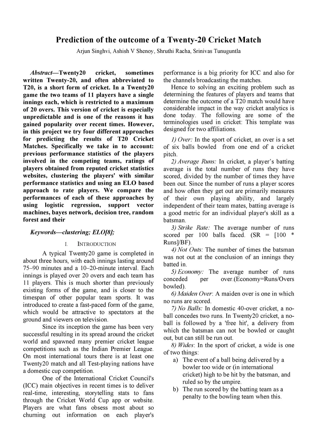 Prediction of the outcome of a Twenty-20 Cricket Match : A Machine