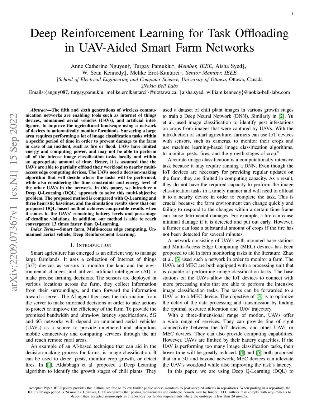 The fifth and sixth generations of wireless communication networks are enabling tools such as internet of things devices, unmanned aerial vehicles (UAVs), and artificial intelligence, to improve the agricultural landscape using a network of devices to automatically monitor farmlands. Surveying a large area requires performing a lot of image classification tasks within a specific period of time in order to prevent damage to the farm in case of an incident, such as fire or flood. UAVs have limited energy and computing power, and may not be able to perform all of the intense image classification tasks locally and within an appropriate amount of time. Hence, it is assumed that the UAVs are able to partially offload their workload to nearby multi-access edge computing devices. The UAVs need a decision-making algorithm that will decide where the tasks will be performed, while also considering the time constraints and energy level of the other UAVs in the network. In this paper, we introduce a Deep Q-Learning (DQL) approach to solve this multi-objective problem. The proposed method is compared with Q-Learning and three heuristic baselines, and the simulation results show that our proposed DQL-based method achieves comparable results when it comes to the UAVs' remaining battery levels and percentage of deadline violations. In addition, our method is able to reach convergence 13 times faster than Q-Learning.