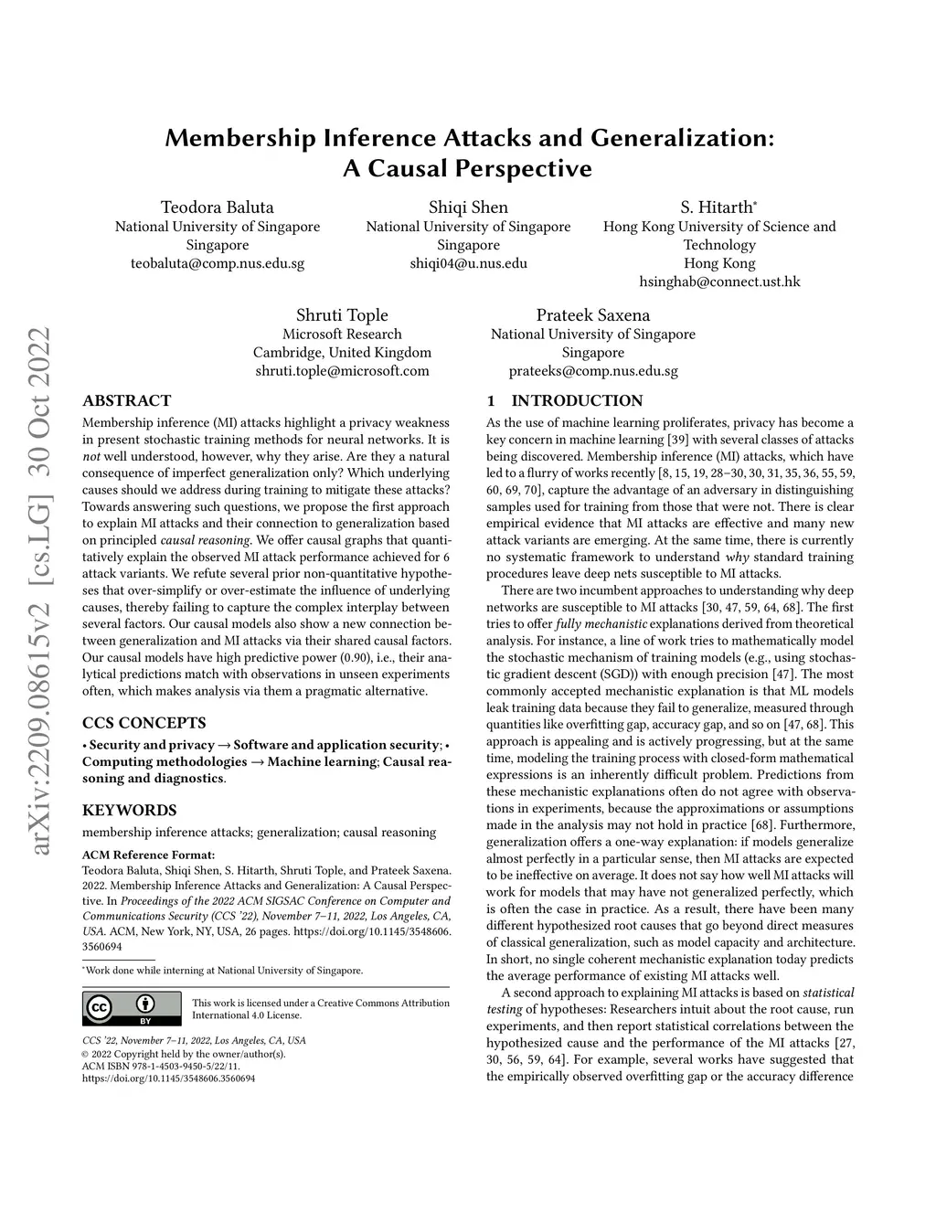 Membership inference (MI) attacks highlight a privacy weakness in present stochastic training methods for neural networks. It is not well understood, however, why they arise. Are they a natural consequence of imperfect generalization only? Which underlying causes should we address during training to mitigate these attacks? Towards answering such questions, we propose the first approach to explain MI attacks and their connection to generalization based on principled causal reasoning. We offer causal graphs that quantitatively explain the observed MI attack performance achieved for attack variants. We refute several prior non-quantitative hypotheses that over-simplify or over-estimate the influence of underlying causes, thereby failing to capture the complex interplay between several factors. Our causal models also show a new connection between generalization and MI attacks via their shared causal factors. Our causal models have high predictive power (), i.e., their analytical predictions match with observations in unseen experiments often, which makes analysis via them a pragmatic alternative.