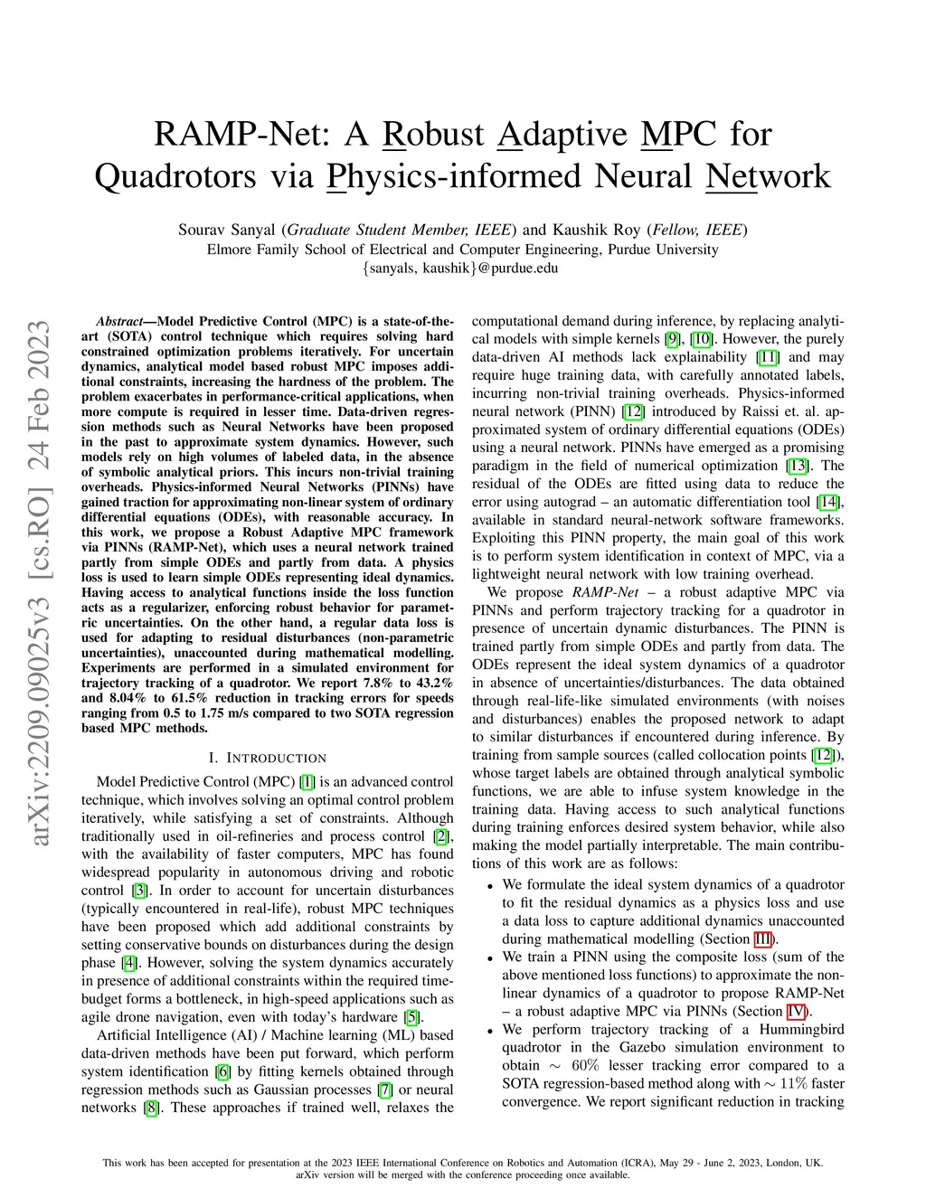 Model Predictive Control (MPC) is a state-of-the-art (SOTA) control technique which requires solving hard constrained optimization problems iteratively. For uncertain dynamics, analytical model based robust MPC imposes additional constraints, increasing the hardness of the problem. The problem exacerbates in performance-critical applications, when more compute is required in lesser time. Data-driven regression methods such as Neural Networks have been proposed in the past to approximate system dynamics. However, such models rely on high volumes of labeled data, in the absence of symbolic analytical priors. This incurs non-trivial training overheads. Physics-informed Neural Networks (PINNs) have gained traction for approximating non-linear system of ordinary differential equations (ODEs), with reasonable accuracy. In this work, we propose a Robust Adaptive MPC framework via PINNs (RAMP-Net), which uses a neural network trained partly from simple ODEs and partly from data. A physics loss is used to learn simple ODEs representing ideal dynamics. Having access to analytical functions inside the loss function acts as a regularizer, enforcing robust behavior for parametric uncertainties. On the other hand, a regular data loss is used for adapting to residual disturbances (non-parametric uncertainties), unaccounted during mathematical modelling. Experiments are performed in a simulated environment for trajectory tracking of a quadrotor. We report 7.8% to 43.2% and 8.04% to 61.5% reduction in tracking errors for speeds ranging from 0.5 to 1.75 m/s compared to two SOTA regression based MPC methods.