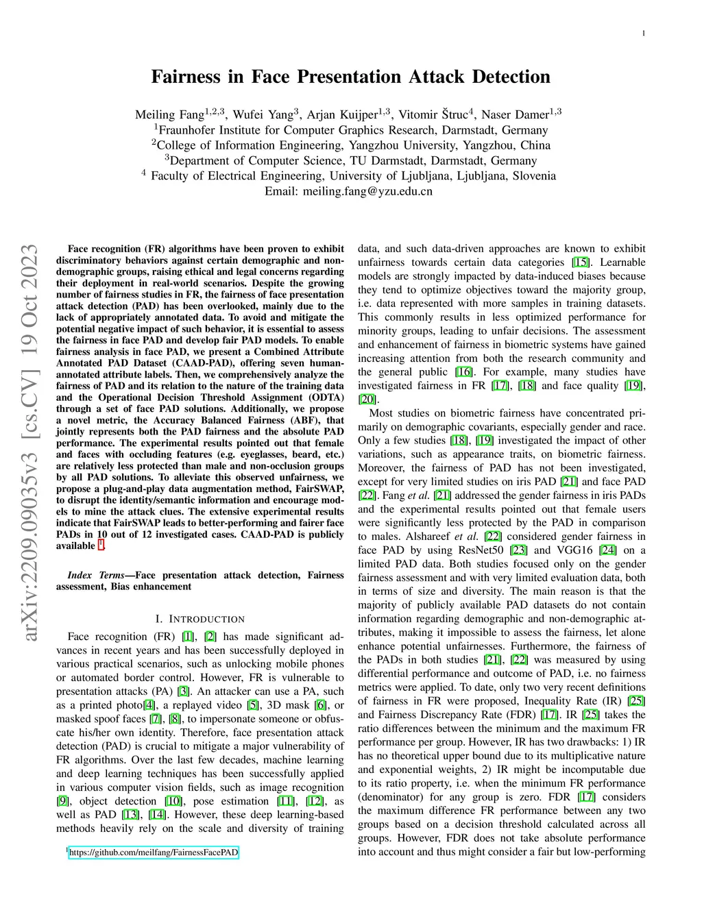 Face recognition (FR) algorithms have been proven to exhibit discriminatory behaviors against certain demographic and non-demographic groups, raising ethical and legal concerns regarding their deployment in real-world scenarios. Despite the growing number of fairness studies in FR, the fairness of face presentation attack detection (PAD) has been overlooked, mainly due to the lack of appropriately annotated data. To avoid and mitigate the potential negative impact of such behavior, it is essential to assess the fairness in face PAD and develop fair PAD models. To enable fairness analysis in face PAD, we present a Combined Attribute Annotated PAD Dataset (CAAD-PAD), offering seven human-annotated attribute labels. Then, we comprehensively analyze the fairness of PAD and its relation to the nature of the training data and the Operational Decision Threshold Assignment (ODTA) through a set of face PAD solutions. Additionally, we propose a novel metric, the Accuracy Balanced Fairness (ABF), that jointly represents both the PAD fairness and the absolute PAD performance. The experimental results pointed out that female and faces with occluding features (e.g. eyeglasses, beard, etc.) are relatively less protected than male and non-occlusion groups by all PAD solutions. To alleviate this observed unfairness, we propose a plug-and-play data augmentation method, FairSWAP, to disrupt the identity/semantic information and encourage models to mine the attack clues. The extensive experimental results indicate that FairSWAP leads to better-performing and fairer face PADs in 10 out of 12 investigated cases.