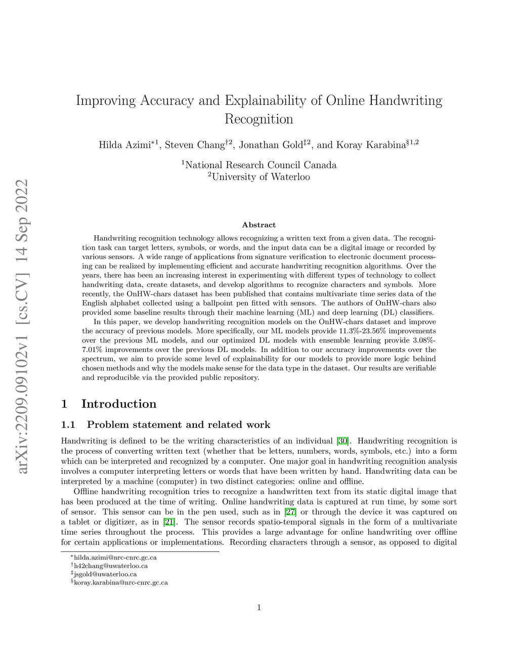 Handwriting recognition technology allows recognizing a written text from a given data. The recognition task can target letters, symbols, or words, and the input data can be a digital image or recorded by various sensors. A wide range of applications from signature verification to electronic document processing can be realized by implementing efficient and accurate handwriting recognition algorithms. Over the years, there has been an increasing interest in experimenting with different types of technology to collect handwriting data, create datasets, and develop algorithms to recognize characters and symbols. More recently, the OnHW-chars dataset has been published that contains multivariate time series data of the English alphabet collected using a ballpoint pen fitted with sensors. The authors of OnHW-chars also provided some baseline results through their machine learning (ML) and deep learning (DL) classifiers. In this paper, we develop handwriting recognition models on the OnHW-chars dataset and improve the accuracy of previous models. More specifically, our ML models provide - improvements over the previous ML models, and our optimized DL models with ensemble learning provide - improvements over the previous DL models. In addition to our accuracy improvements over the spectrum, we aim to provide some level of explainability for our models to provide more logic behind chosen methods and why the models make sense for the data type in the dataset. Our results are verifiable and reproducible via the provided public repository.