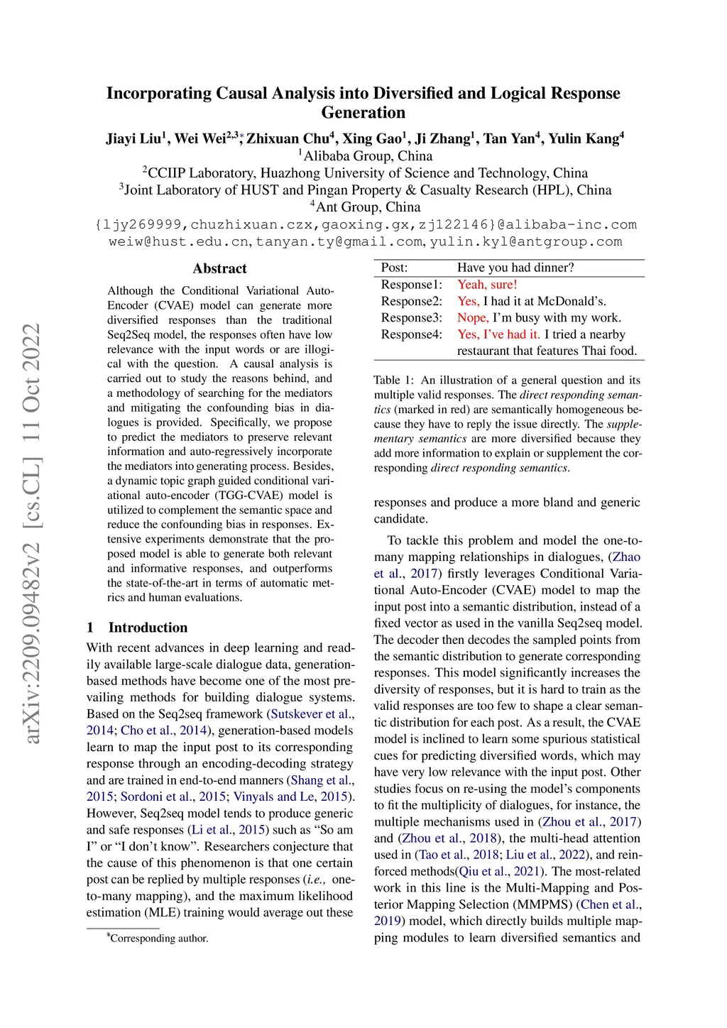Although the Conditional Variational AutoEncoder (CVAE) model can generate more diversified responses than the traditional Seq2Seq model, the responses often have low relevance with the input words or are illogical with the question. A causal analysis is carried out to study the reasons behind, and a methodology of searching for the mediators and mitigating the confounding bias in dialogues is provided. Specifically, we propose to predict the mediators to preserve relevant information and auto-regressively incorporate the mediators into generating process. Besides, a dynamic topic graph guided conditional variational autoencoder (TGG-CVAE) model is utilized to complement the semantic space and reduce the confounding bias in responses. Extensive experiments demonstrate that the proposed model is able to generate both relevant and informative responses, and outperforms the state-of-the-art in terms of automatic metrics and human evaluations.