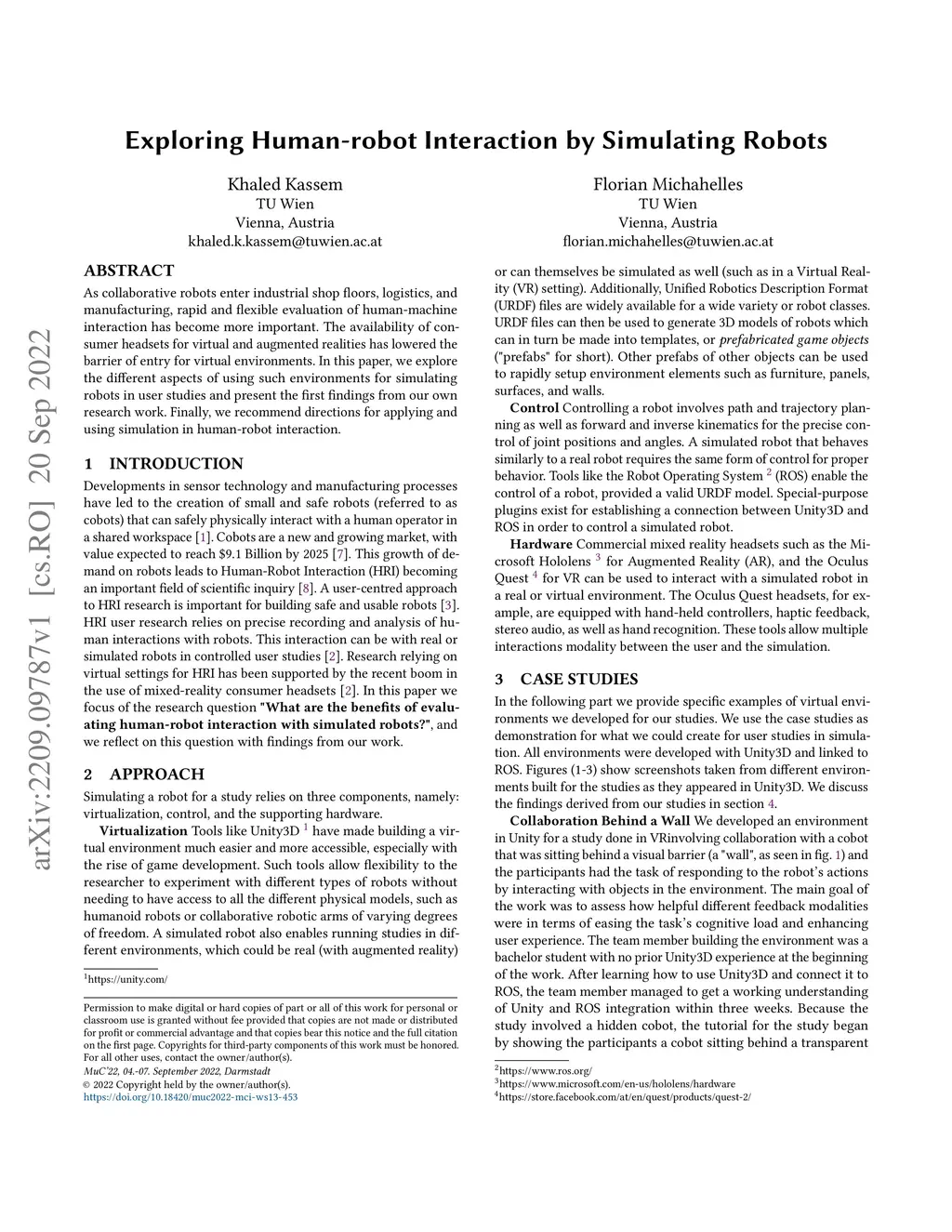 As collaborative robots enter industrial shop floors, logistics, and manufacturing, rapid and flexible evaluation of human-machine interaction has become more important. The availability of consumer headsets for virtual and augmented realities has lowered the barrier of entry for virtual environments. In this paper, we explore the different aspects of using such environments for simulating robots in user studies and present the first findings from our own research work. Finally, we recommend directions for applying and using simulation in human-robot interaction.