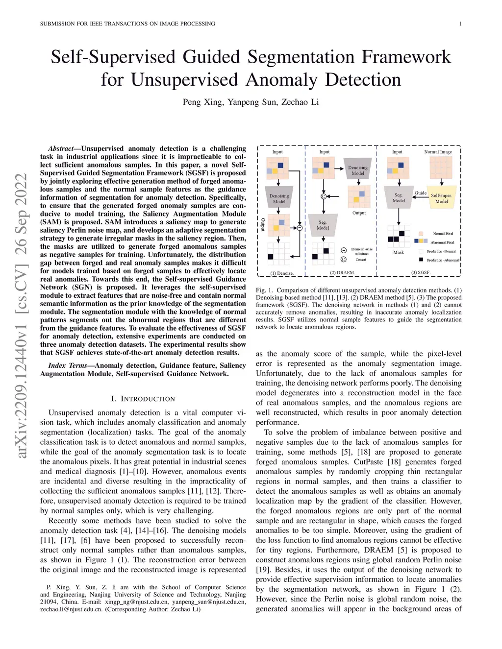 Unsupervised anomaly detection is a challenging task in industrial applications since it is impracticable to collect sufficient anomalous samples. In this paper, a novel Self-Supervised Guided Segmentation Framework (SGSF) is proposed by jointly exploring effective generation method of forged anomalous samples and the normal sample features as the guidance information of segmentation for anomaly detection. Specifically, to ensure that the generated forged anomaly samples are conducive to model training, the Saliency Augmentation Module (SAM) is proposed. SAM introduces a saliency map to generate saliency Perlin noise map, and develops an adaptive segmentation strategy to generate irregular masks in the saliency region. Then, the masks are utilized to generate forged anomalous samples as negative samples for training. Unfortunately, the distribution gap between forged and real anomaly samples makes it difficult for models trained based on forged samples to effectively locate real anomalies. Towards this end, the Self-supervised Guidance Network (SGN) is proposed. It leverages the self-supervised module to extract features that are noise-free and contain normal semantic information as the prior knowledge of the segmentation module. The segmentation module with the knowledge of normal patterns segments out the abnormal regions that are different from the guidance features. To evaluate the effectiveness of SGSF for anomaly detection, extensive experiments are conducted on three anomaly detection datasets. The experimental results show that SGSF achieves state-of-the-art anomaly detection results.