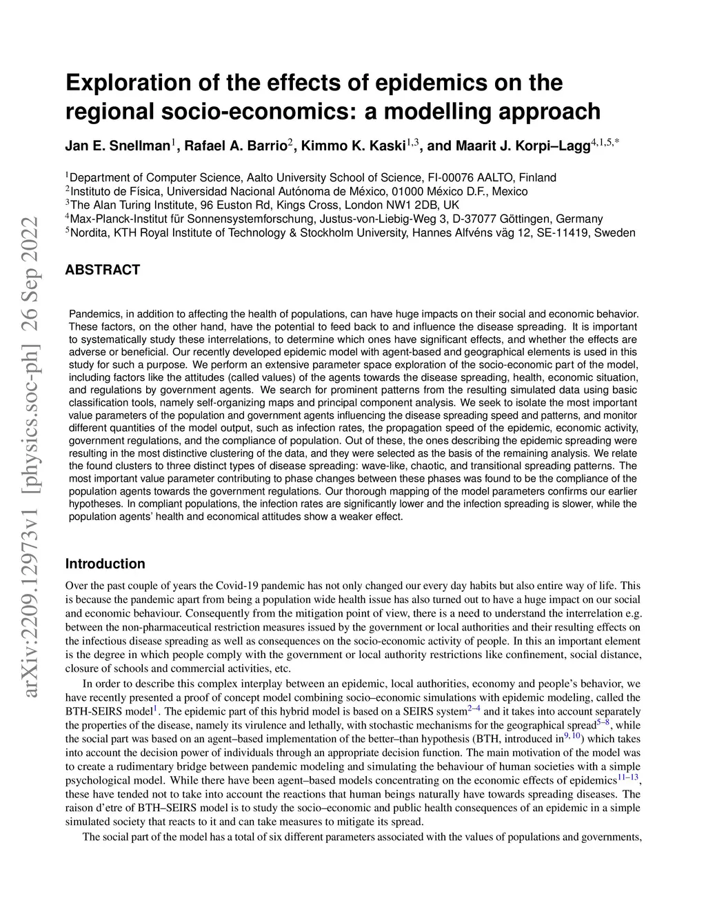 Pandemics, in addition to affecting the health of populations, can have huge impacts on their social and economic behavior. These factors, on the other hand, have the potential to feed back to and influence the disease spreading. It is important to systematically study these interrelations, to determine which ones have significant effects, and whether the effects are adverse or beneficial. Our recently developed epidemic model with agent-based and geographical elements is used in this study for such a purpose. We perform an extensive parameter space exploration of the socio-economic part of the model, including factors like the attitudes (called values) of the agents towards the disease spreading, health, economic situation, and regulations by government agents. We search for prominent patterns from the resulting simulated data using basic classification tools, namely self-organizing maps and principal component analysis. We seek to isolate the most important value parameters of the population and government agents influencing the disease spreading speed and patterns, and monitor different quantities of the model output, such as infection rates, the propagation speed of the epidemic, economic activity, government regulations, and the compliance of population. Out of these, the ones describing the epidemic spreading were resulting in the most distinctive clustering of the data, and they were selected as the basis of the remaining analysis. We relate the found clusters to three distinct types of disease spreading: wave-like, chaotic, and transitional spreading patterns. The most important value parameter contributing to phase changes between these phases was found to be the compliance of the population agents towards the government regulations.