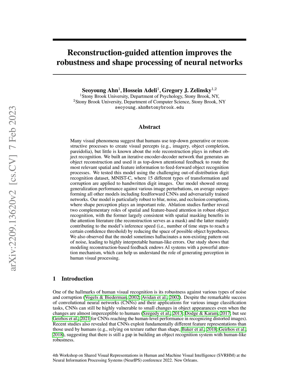 Many visual phenomena suggest that humans use top-down generative or reconstructive processes to create visual percepts (e.g., imagery, object completion, pareidolia), but little is known about the role reconstruction plays in robust object recognition. We built an iterative encoder-decoder network that generates an object reconstruction and used it as top-down attentional feedback to route the most relevant spatial and feature information to feed-forward object recognition processes. We tested this model using the challenging out-of-distribution digit recognition dataset, MNIST-C, where 15 different types of transformation and corruption are applied to handwritten digit images. Our model showed strong generalization performance against various image perturbations, on average outperforming all other models including feedforward CNNs and adversarially trained networks. Our model is particularly robust to blur, noise, and occlusion corruptions, where shape perception plays an important role. Ablation studies further reveal two complementary roles of spatial and feature-based attention in robust object recognition, with the former largely consistent with spatial masking benefits in the attention literature (the reconstruction serves as a mask) and the latter mainly contributing to the model's inference speed (i.e., number of time steps to reach a certain confidence threshold) by reducing the space of possible object hypotheses. We also observed that the model sometimes hallucinates a non-existing pattern out of noise, leading to highly interpretable human-like errors. Our study shows that modeling reconstruction-based feedback endows AI systems with a powerful attention mechanism, which can help us understand the role of generating perception in human visual processing.