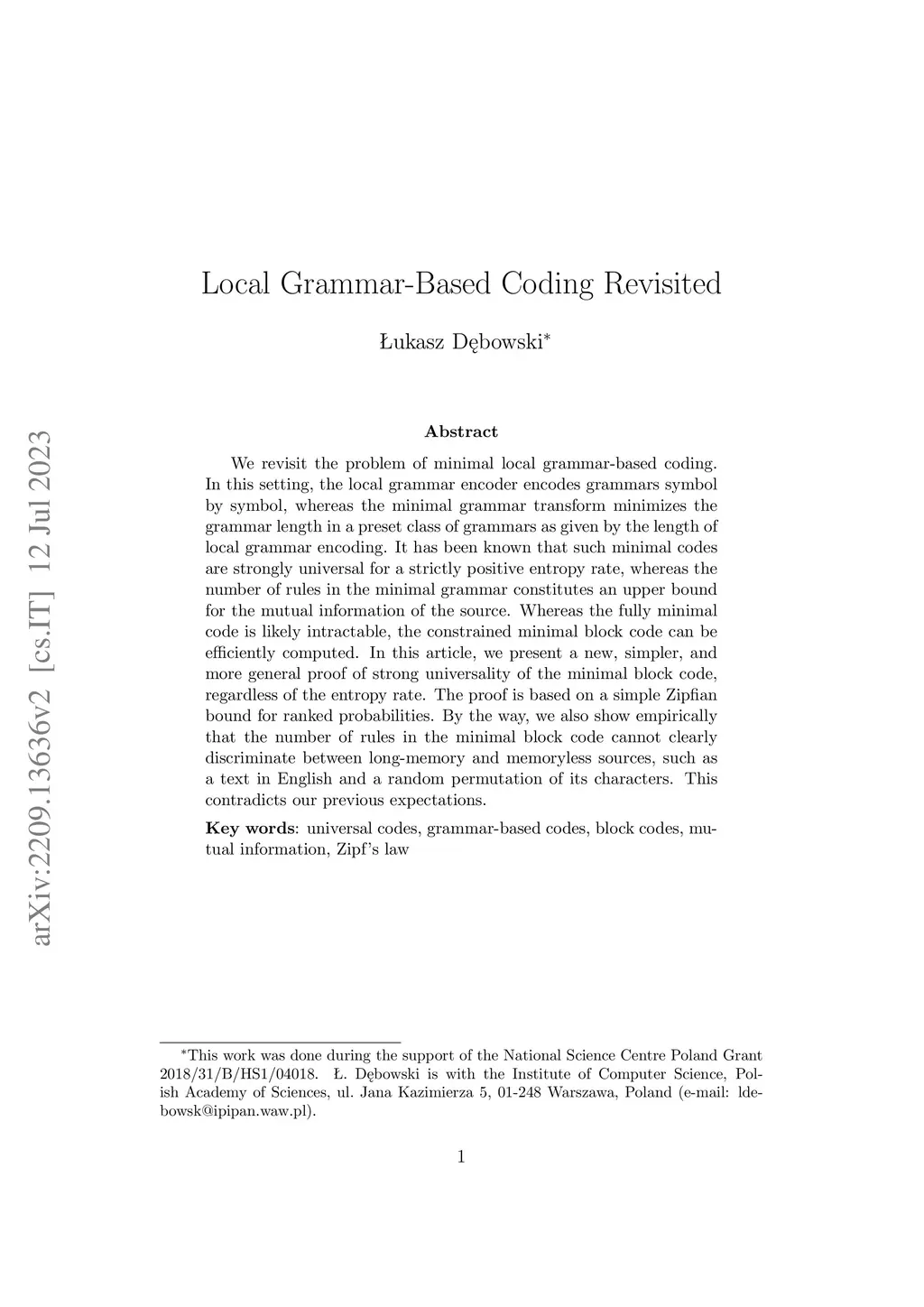 In the setting of minimal local grammar-based coding, the input string is represented as a grammar with the minimal output length defined via simple symbol-by-symbol encoding. This paper discusses four contributions to this field. First, we invoke a simple harmonic bound on ranked probabilities, which reminds Zipf's law and simplifies universality proofs for minimal local grammar-based codes. Second, we refine known bounds on the vocabulary size, showing its partial power-law equivalence with mutual information and redundancy. These bounds are relevant for linking Zipf's law with the neural scaling law for large language models. Third, we develop a framework for universal codes with fixed infinite vocabularies, recasting universal coding as matching ranked patterns that are independent of empirical data. Finally, we analyze grammar-based codes with finite vocabularies being empirical rank lists, proving that that such codes are also universal. These results extend foundations of universal grammar-based coding and reaffirm previously stated connections to power laws for human language and language models.