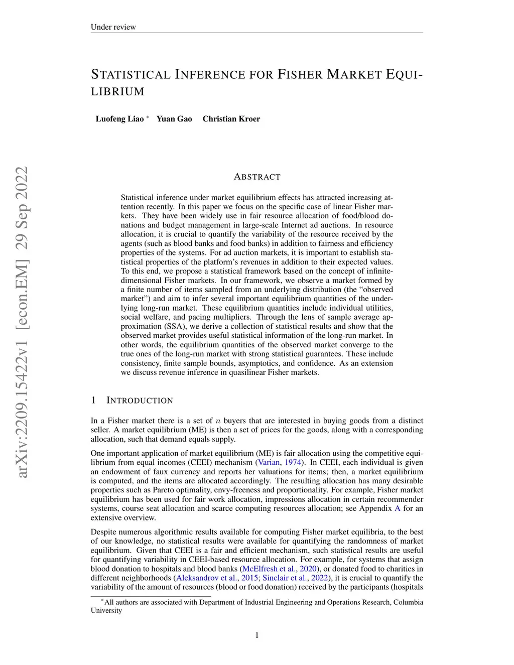 Statistical inference under market equilibrium effects has attracted increasing attention recently. In this paper we focus on the specific case of linear Fisher markets. They have been widely use in fair resource allocation of food/blood donations and budget management in large-scale Internet ad auctions. In resource allocation, it is crucial to quantify the variability of the resource received by the agents (such as blood banks and food banks) in addition to fairness and efficiency properties of the systems. For ad auction markets, it is important to establish statistical properties of the platform's revenues in addition to their expected values. To this end, we propose a statistical framework based on the concept of infinite-dimensional Fisher markets. In our framework, we observe a market formed by a finite number of items sampled from an underlying distribution (the "observed market") and aim to infer several important equilibrium quantities of the underlying long-run market. These equilibrium quantities include individual utilities, social welfare, and pacing multipliers. Through the lens of sample average approximation (SSA), we derive a collection of statistical results and show that the observed market provides useful statistical information of the long-run market. In other words, the equilibrium quantities of the observed market converge to the true ones of the long-run market with strong statistical guarantees. These include consistency, finite sample bounds, asymptotics, and confidence. As an extension, we discuss revenue inference in quasilinear Fisher markets.