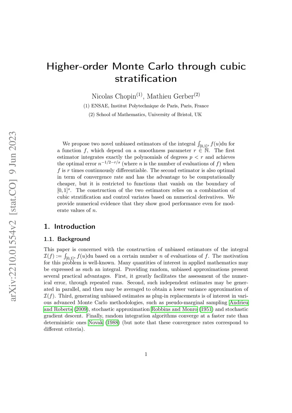 We propose two novel unbiased estimators of the integral for a function , which depend on a smoothness parameter . The first estimator integrates exactly the polynomials of degrees and achieves the optimal error (where is the number of evaluations of ) when is times continuously differentiable. The second estimator is computationally cheaper but it is restricted to functions that vanish on the boundary of . The construction of the two estimators relies on a combination of cubic stratification and control ariates based on numerical derivatives. We provide numerical evidence that they show good performance even for moderate values of .
