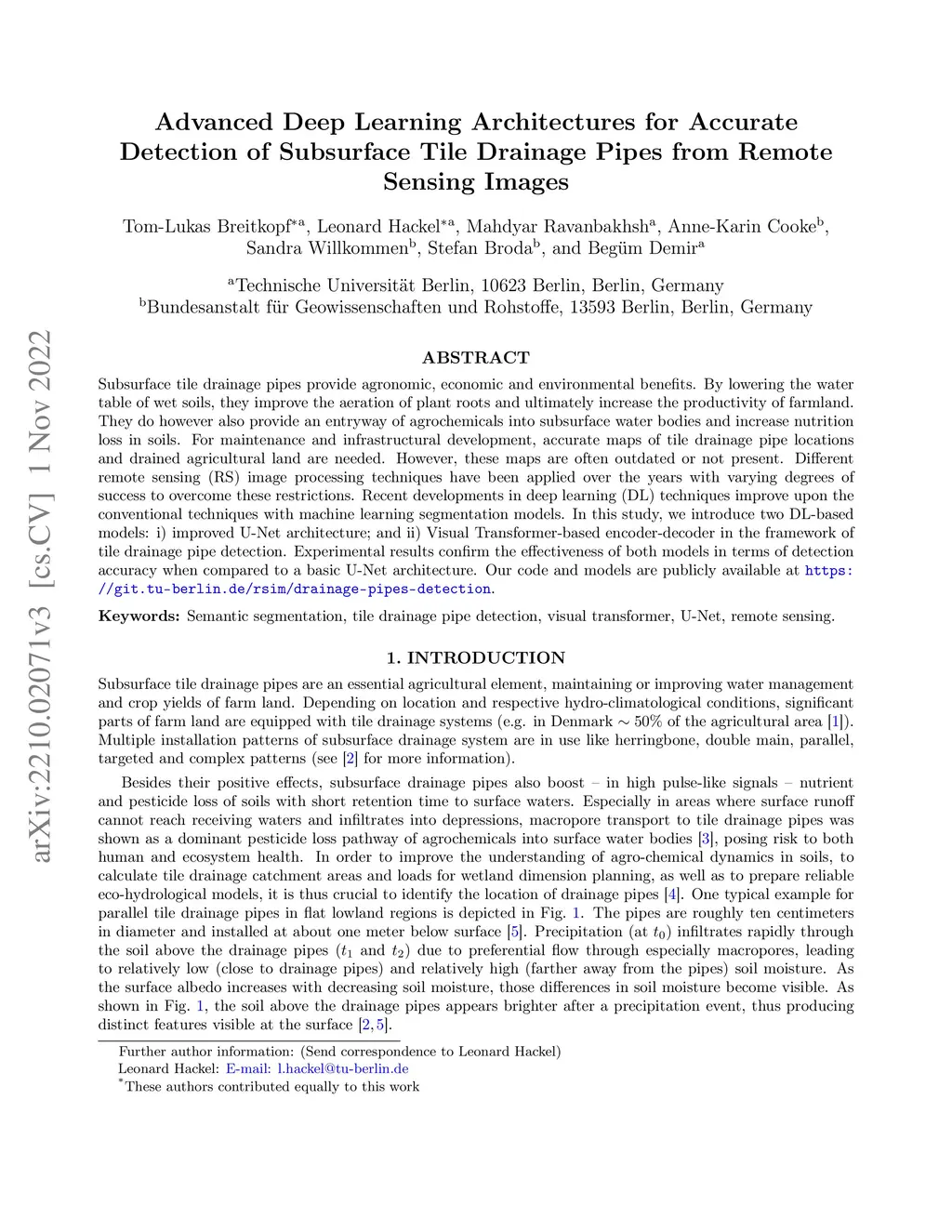 Subsurface tile drainage pipes provide agronomic, economic and environmental benefits. By lowering the water table of wet soils, they improve the aeration of plant roots and ultimately increase the productivity of farmland. They do however also provide an entryway of agrochemicals into subsurface water bodies and increase nutrition loss in soils. For maintenance and infrastructural development, accurate maps of tile drainage pipe locations and drained agricultural land are needed. However, these maps are often outdated or not present. Different remote sensing (RS) image processing techniques have been applied over the years with varying degrees of success to overcome these restrictions. Recent developments in deep learning (DL) techniques improve upon the conventional techniques with machine learning segmentation models. In this study, we introduce two DL-based models: i) improved U-Net architecture; and ii) Visual Transformer-based encoder-decoder in the framework of tile drainage pipe detection. Experimental results confirm the effectiveness of both models in terms of detection accuracy when compared to a basic U-Net architecture. Our code and models are publicly available at https://git.tu-berlin.de/rsim/drainage-pipes-detection.
