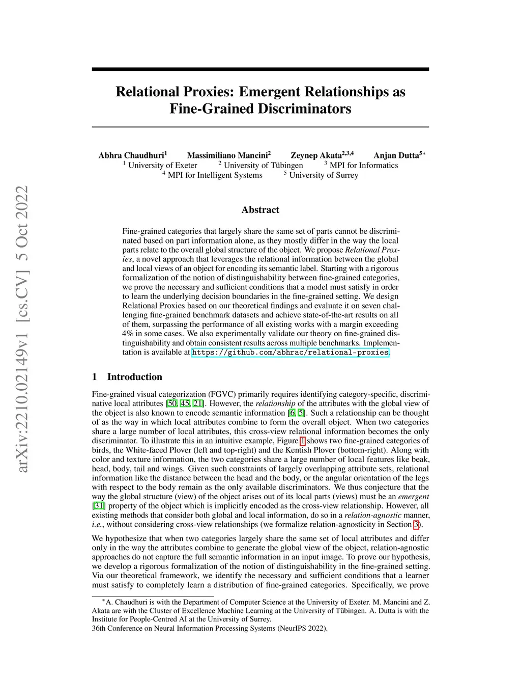 Fine-grained categories that largely share the same set of parts cannot be discriminated based on part information alone, as they mostly differ in the way the local parts relate to the overall global structure of the object. We propose Relational Proxies, a novel approach that leverages the relational information between the global and local views of an object for encoding its semantic label. Starting with a rigorous formalization of the notion of distinguishability between fine-grained categories, we prove the necessary and sufficient conditions that a model must satisfy in order to learn the underlying decision boundaries in the fine-grained setting. We design Relational Proxies based on our theoretical findings and evaluate it on seven challenging fine-grained benchmark datasets and achieve state-of-the-art results on all of them, surpassing the performance of all existing works with a margin exceeding 4% in some cases. We also experimentally validate our theory on fine-grained distinguishability and obtain consistent results across multiple benchmarks. Implementation is available at https://github.com/abhrac/relational-proxies.