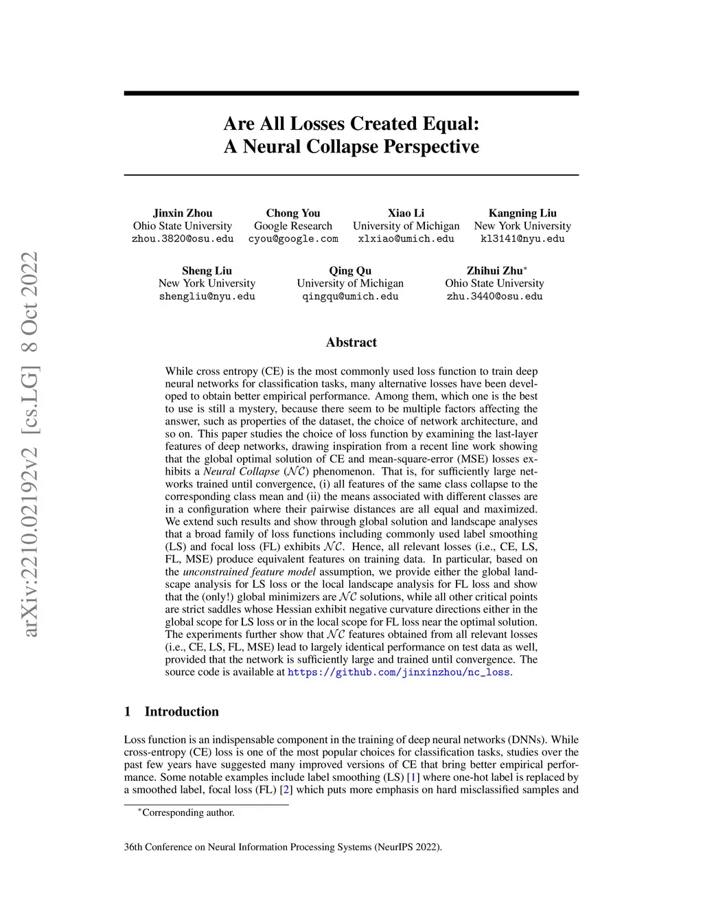 While cross entropy (CE) is the most commonly used loss to train deep neural networks for classification tasks, many alternative losses have been developed to obtain better empirical performance. Among them, which one is the best to use is still a mystery, because there seem to be multiple factors affecting the answer, such as properties of the dataset, the choice of network architecture, and so on. This paper studies the choice of loss function by examining the last-layer features of deep networks, drawing inspiration from a recent line work showing that the global optimal solution of CE and mean-square-error (MSE) losses exhibits a Neural Collapse phenomenon. That is, for sufficiently large networks trained until convergence, (i) all features of the same class collapse to the corresponding class mean and (ii) the means associated with different classes are in a configuration where their pairwise distances are all equal and maximized. We extend such results and show through global solution and landscape analyses that a broad family of loss functions including commonly used label smoothing (LS) and focal loss (FL) exhibits Neural Collapse. Hence, all relevant losses(i.e., CE, LS, FL, MSE) produce equivalent features on training data. Based on the unconstrained feature model assumption, we provide either the global landscape analysis for LS loss or the local landscape analysis for FL loss and show that the (only!) global minimizers are neural collapse solutions, while all other critical points are strict saddles whose Hessian exhibit negative curvature directions either in the global scope for LS loss or in the local scope for FL loss near the optimal solution. The experiments further show that Neural Collapse features obtained from all relevant losses lead to largely identical performance on test data as well, provided that the network is sufficiently large and trained until convergence.
