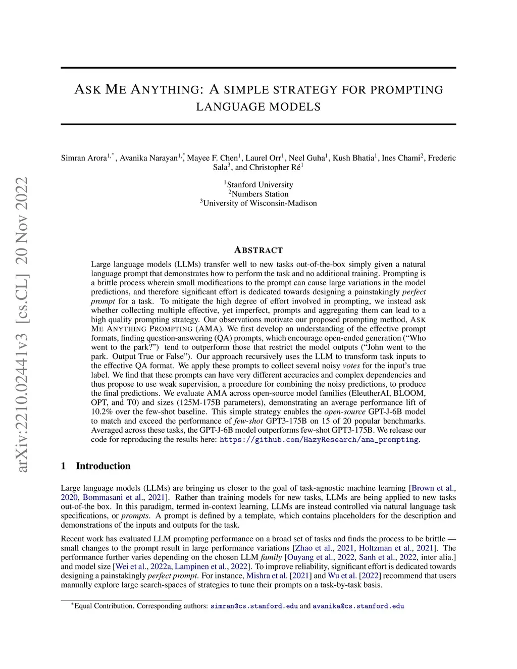 Large language models (LLMs) transfer well to new tasks out-of-the-box simply given a natural language prompt that demonstrates how to perform the task and no additional training. Prompting is a brittle process wherein small modifications to the prompt can cause large variations in the model predictions, and therefore significant effort is dedicated towards designing a painstakingly "perfect prompt" for a task. To mitigate the high degree of effort involved in prompt-design, we instead ask whether producing multiple effective, yet imperfect, prompts and aggregating them can lead to a high quality prompting strategy. Our observations motivate our proposed prompting method, ASK ME ANYTHING (AMA). We first develop an understanding of the effective prompt formats, finding that question-answering (QA) prompts, which encourage open-ended generation ("Who went to the park?") tend to outperform those that restrict the model outputs ("John went to the park. Output True or False."). Our approach recursively uses the LLM itself to transform task inputs to the effective QA format. We apply the collected prompts to obtain several noisy votes for the input's true label. We find that the prompts can have very different accuracies and complex dependencies and thus propose to use weak supervision, a procedure for combining the noisy predictions, to produce the final predictions for the inputs. We evaluate AMA across open-source model families (e.g., EleutherAI, BLOOM, OPT, and T0) and model sizes (125M-175B parameters), demonstrating an average performance lift of 10.2% over the few-shot baseline. This simple strategy enables the open-source GPT-J-6B model to match and exceed the performance of few-shot GPT3-175B on 15 of 20 popular benchmarks. Averaged across these tasks, the GPT-J-6B model outperforms few-shot GPT3-175B. We release our code here: https://github.com/HazyResearch/ama_prompting