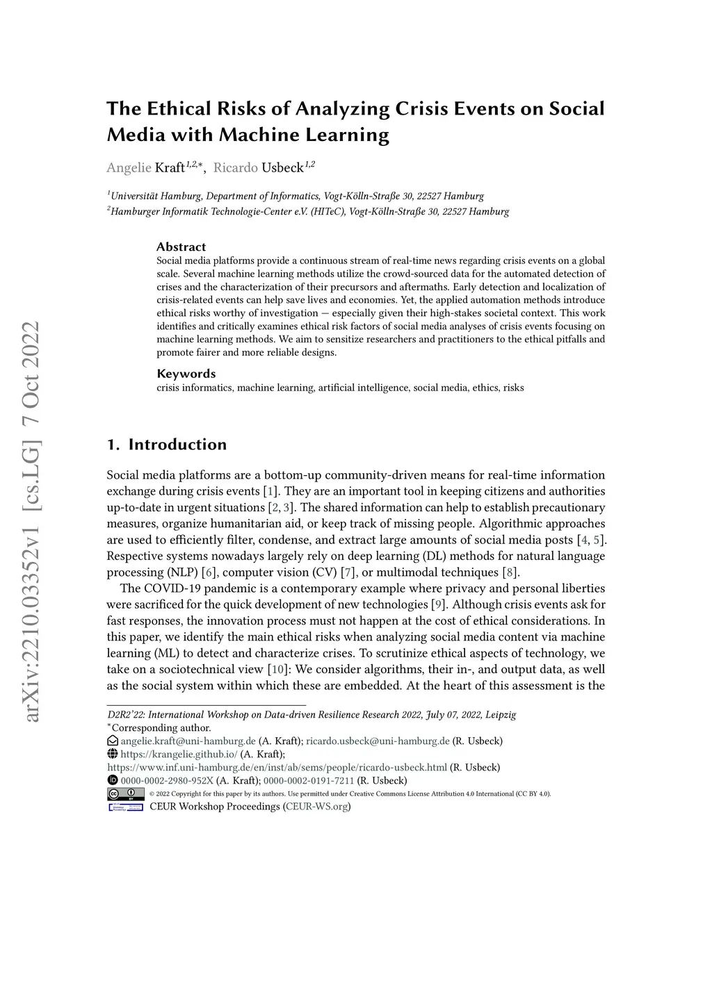 Social media platforms provide a continuous stream of real-time news regarding crisis events on a global scale. Several machine learning methods utilize the crowd-sourced data for the automated detection of crises and the characterization of their precursors and aftermaths. Early detection and localization of crisis-related events can help save lives and economies. Yet, the applied automation methods introduce ethical risks worthy of investigation - especially given their high-stakes societal context. This work identifies and critically examines ethical risk factors of social media analyses of crisis events focusing on machine learning methods. We aim to sensitize researchers and practitioners to the ethical pitfalls and promote fairer and more reliable designs.