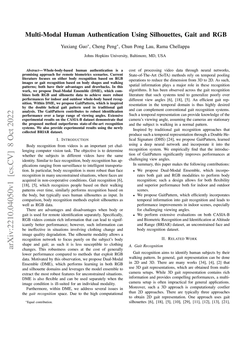 Whole-body-based human authentication is a promising approach for remote biometrics scenarios. Current literature focuses on either body recognition based on RGB images or gait recognition based on body shapes and walking patterns; both have their advantages and drawbacks. In this work, we propose Dual-Modal Ensemble (DME), which combines both RGB and silhouette data to achieve more robust performances for indoor and outdoor whole-body based recognition. Within DME, we propose GaitPattern, which is inspired by the double helical gait pattern used in traditional gait analysis. The GaitPattern contributes to robust identification performance over a large range of viewing angles. Extensive experimental results on the CASIA-B dataset demonstrate that the proposed method outperforms state-of-the-art recognition systems. We also provide experimental results using the newly collected BRIAR dataset.