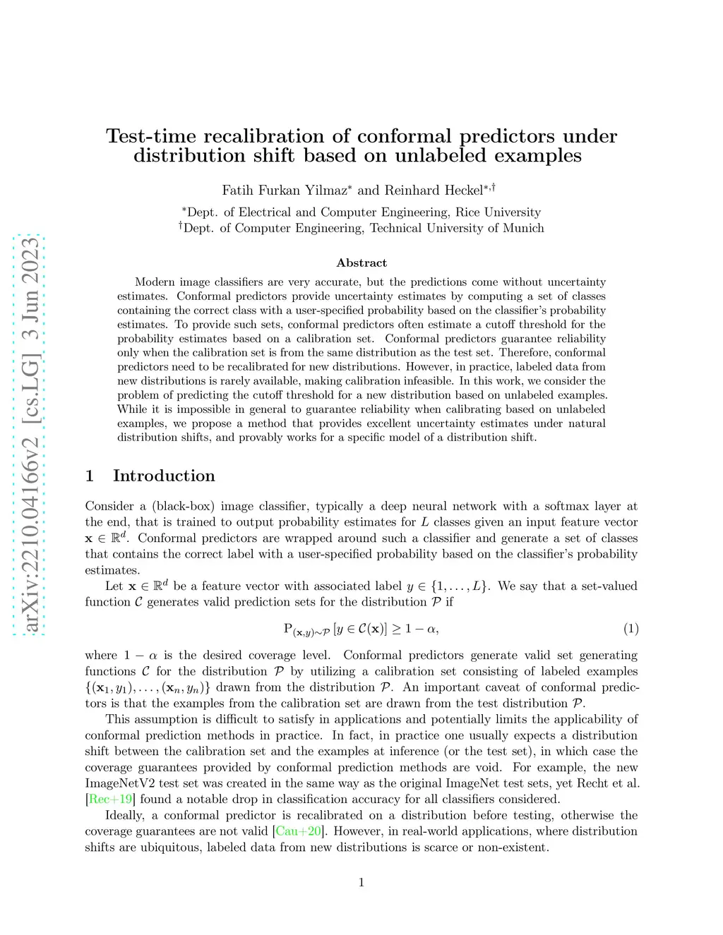 Modern image classifiers are very accurate, but the predictions come without uncertainty estimates. Conformal predictors provide uncertainty estimates by computing a set of classes containing the correct class with a user-specified probability based on the classifier's probability estimates. To provide such sets, conformal predictors often estimate a cutoff threshold for the probability estimates based on a calibration set. Conformal predictors guarantee reliability only when the calibration set is from the same distribution as the test set. Therefore, conformal predictors need to be recalibrated for new distributions. However, in practice, labeled data from new distributions is rarely available, making calibration infeasible. In this work, we consider the problem of predicting the cutoff threshold for a new distribution based on unlabeled examples. While it is impossible in general to guarantee reliability when calibrating based on unlabeled examples, we propose a method that provides excellent uncertainty estimates under natural distribution shifts, and provably works for a specific model of a distribution shift.