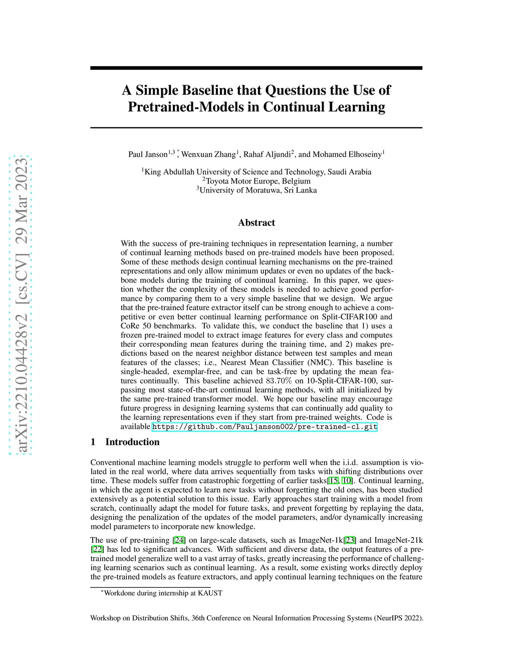 With the success of pretraining techniques in representation learning, a number of continual learning methods based on pretrained models have been proposed. Some of these methods design continual learning mechanisms on the pre-trained representations and only allow minimum updates or even no updates of the backbone models during the training of continual learning. In this paper, we question whether the complexity of these models is needed to achieve good performance by comparing them to a simple baseline that we designed. We argue that the pretrained feature extractor itself can be strong enough to achieve a competitive or even better continual learning performance on Split-CIFAR100 and CoRe 50 benchmarks. To validate this, we conduct a very simple baseline that 1) use the frozen pretrained model to extract image features for every class encountered during the continual learning stage and compute their corresponding mean features on training data, and 2) predict the class of the input based on the nearest neighbor distance between test samples and mean features of the classes; i.e., Nearest Mean Classifier (NMC). This baseline is single-headed, exemplar-free, and can be task-free (by updating the means continually). This baseline achieved 88.53% on 10-Split-CIFAR-100, surpassing most state-of-the-art continual learning methods that are all initialized using the same pretrained transformer model. We hope our baseline may encourage future progress in designing learning systems that can continually add quality to the learning representations even if they started from some pretrained weights.