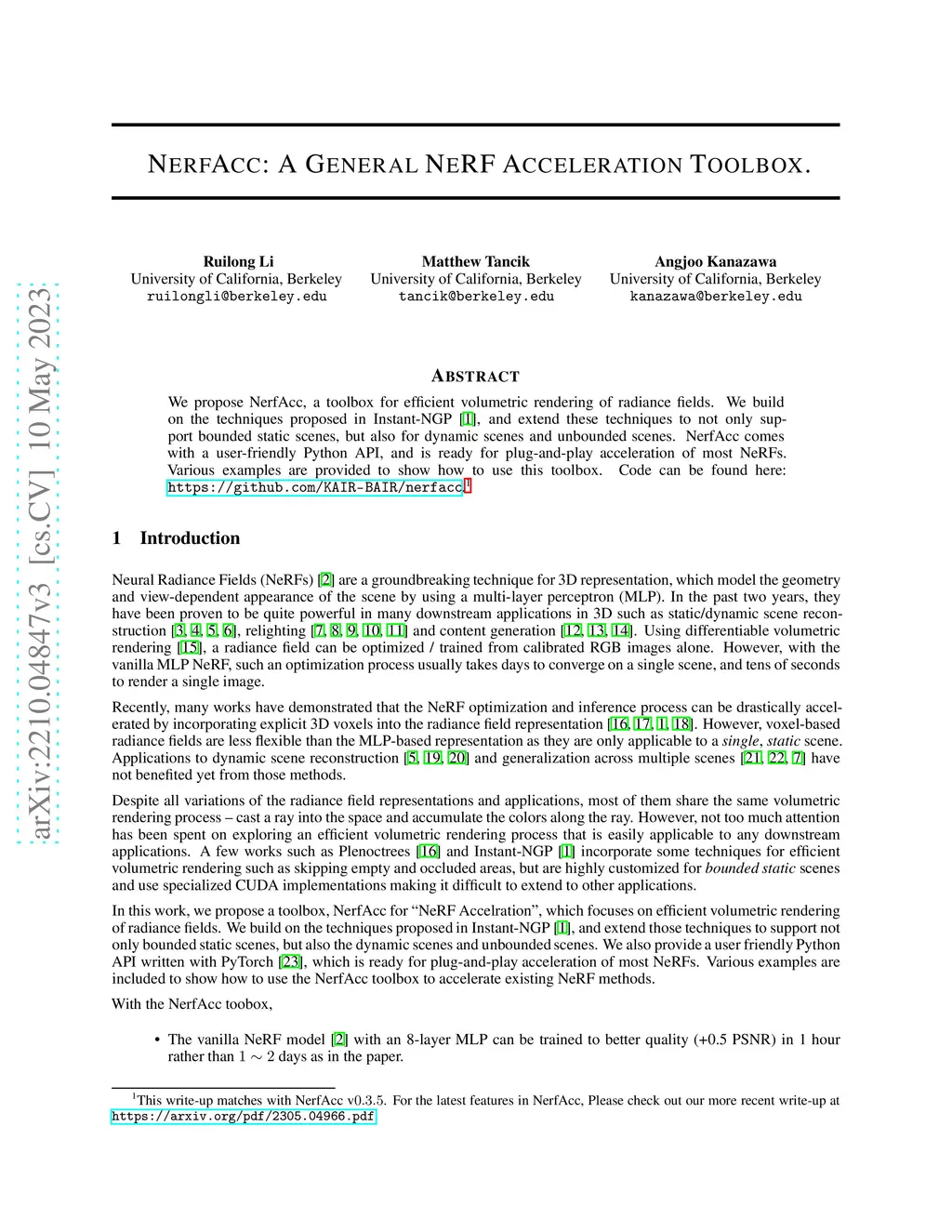 We propose NerfAcc, a toolbox for efficient volumetric rendering of radiance fields. We build on the techniques proposed in Instant-NGP, and extend these techniques to not only support bounded static scenes, but also for dynamic scenes and unbounded scenes. NerfAcc comes with a user-friendly Python API, and is ready for plug-and-play acceleration of most NeRFs. Various examples are provided to show how to use this toolbox. Code can be found here: https://github.com/KAIR-BAIR/nerfacc. Note this write-up matches with NerfAcc v0.3.5. For the latest features in NerfAcc, please check out our more recent write-up at arXiv:2305.04966