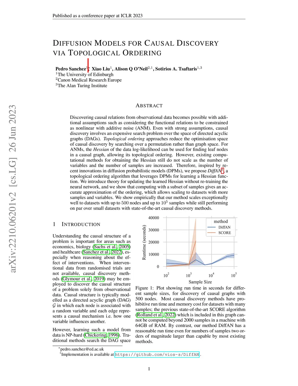 Discovering causal relations from observational data becomes possible with additional assumptions such as considering the functional relations to be constrained as nonlinear with additive noise (ANM). Even with strong assumptions, causal discovery involves an expensive search problem over the space of directed acyclic graphs (DAGs). \emph{Topological ordering} approaches reduce the optimisation space of causal discovery by searching over a permutation rather than graph space. For ANMs, the \emph{Hessian} of the data log-likelihood can be used for finding leaf nodes in a causal graph, allowing its topological ordering. However, existing computational methods for obtaining the Hessian still do not scale as the number of variables and the number of samples increase. Therefore, inspired by recent innovations in diffusion probabilistic models (DPMs), we propose \emph{DiffAN}\footnote{Implementation is available at \url{https://github.com/vios-s/DiffAN} .}, a topological ordering algorithm that leverages DPMs for learning a Hessian function. We introduce theory for updating the learned Hessian without re-training the neural network, and we show that computing with a subset of samples gives an accurate approximation of the ordering, which allows scaling to datasets with more samples and variables. We show empirically that our method scales exceptionally well to datasets with up to nodes and up to samples while still performing on par over small datasets with state-of-the-art causal discovery methods. Implementation is available at https://github.com/vios-s/DiffAN .