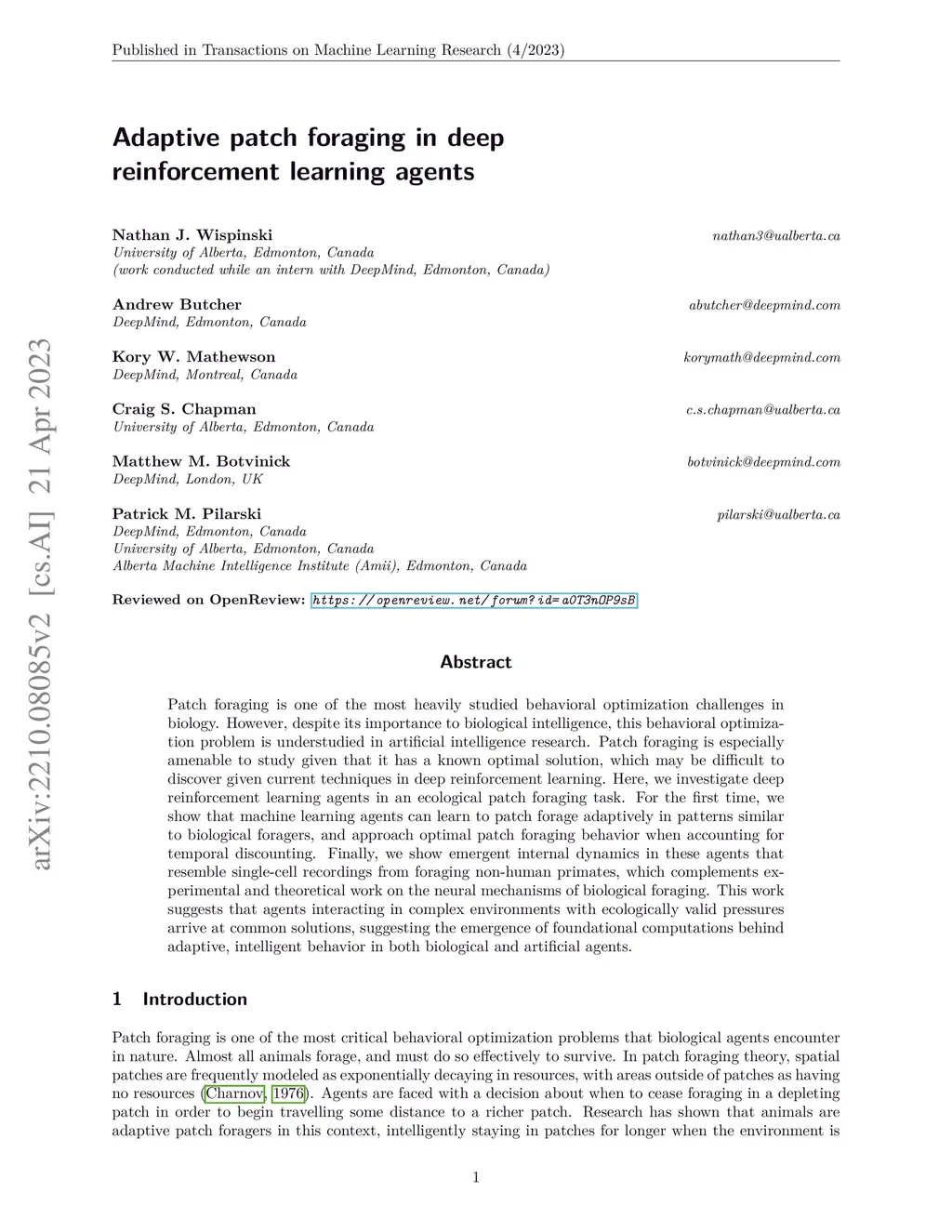 Adaptive patch foraging in deep reinforcement learning agents