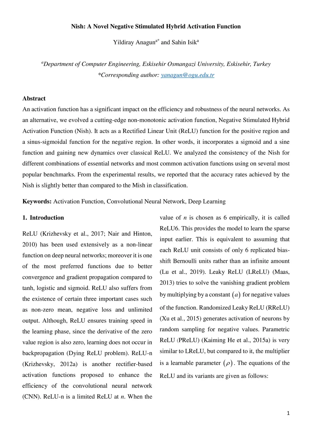 An activation function has a significant impact on the efficiency and robustness of the neural networks. As an alternative, we evolved a cutting-edge non-monotonic activation function, Negative Stimulated Hybrid Activation Function (Nish). It acts as a Rectified Linear Unit (ReLU) function for the positive region and a sinus-sigmoidal function for the negative region. In other words, it incorporates a sigmoid and a sine function and gaining new dynamics over classical ReLU. We analyzed the consistency of the Nish for different combinations of essential networks and most common activation functions using on several most popular benchmarks. From the experimental results, we reported that the accuracy rates achieved by the Nish is slightly better than compared to the Mish in classification.