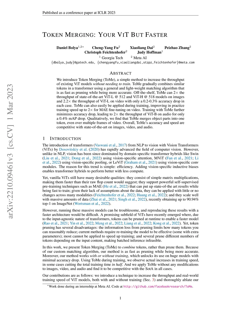 We introduce Token Merging (ToMe), a simple method to increase the throughput of existing ViT models without needing to train. ToMe gradually combines similar tokens in a transformer using a general and light-weight matching algorithm that is as fast as pruning while being more accurate. Off-the-shelf, ToMe can 2x the throughput of state-of-the-art ViT-L @ 512 and ViT-H @ 518 models on images and 2.2x the throughput of ViT-L on video with only a 0.2-0.3% accuracy drop in each case. ToMe can also easily be applied during training, improving in practice training speed up to 2x for MAE fine-tuning on video. Training with ToMe further minimizes accuracy drop, leading to 2x the throughput of ViT-B on audio for only a 0.4% mAP drop. Qualitatively, we find that ToMe merges object parts into one token, even over multiple frames of video. Overall, ToMe's accuracy and speed are competitive with state-of-the-art on images, video, and audio.
