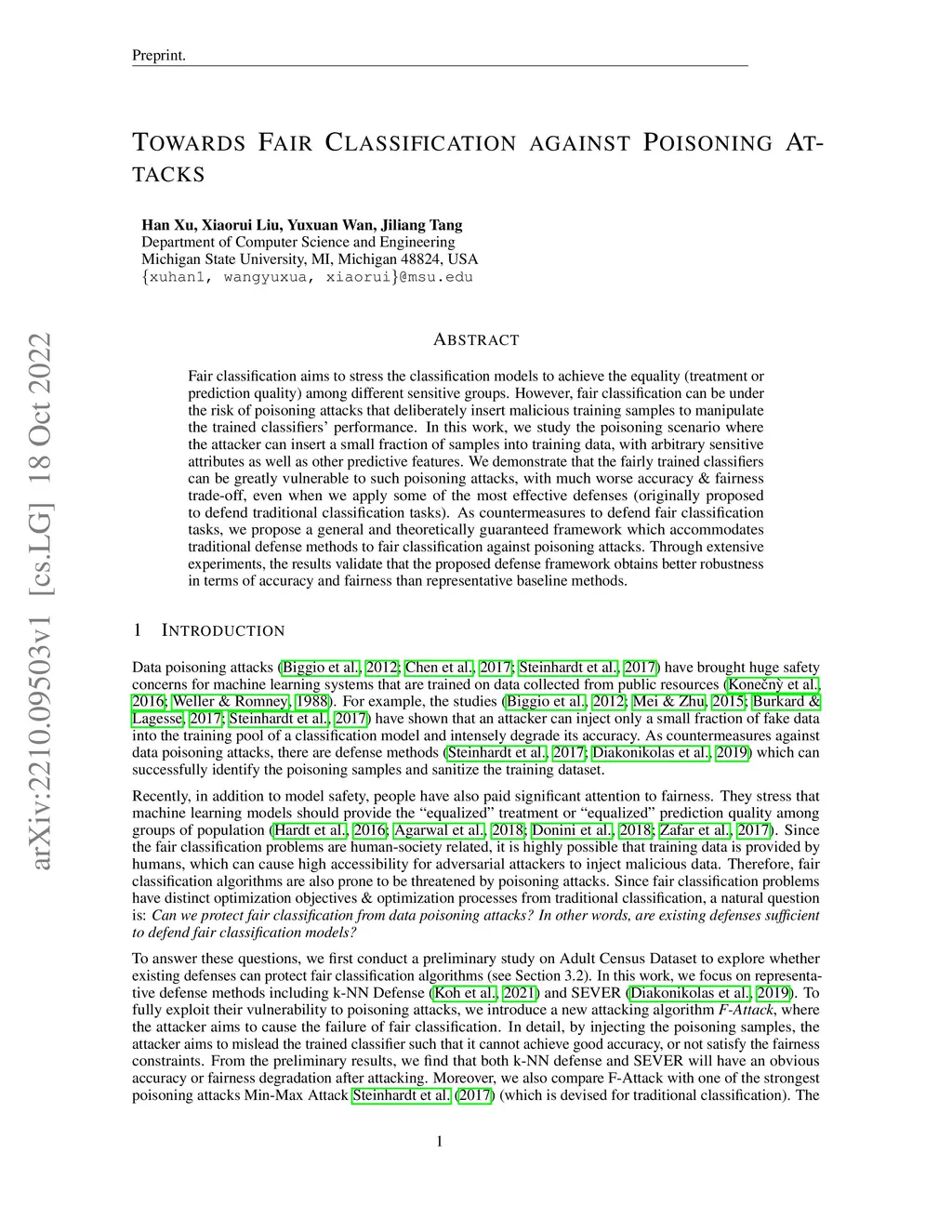 Fair classification aims to stress the classification models to achieve the equality (treatment or prediction quality) among different sensitive groups. However, fair classification can be under the risk of poisoning attacks that deliberately insert malicious training samples to manipulate the trained classifiers' performance. In this work, we study the poisoning scenario where the attacker can insert a small fraction of samples into training data, with arbitrary sensitive attributes as well as other predictive features. We demonstrate that the fairly trained classifiers can be greatly vulnerable to such poisoning attacks, with much worse accuracy & fairness trade-off, even when we apply some of the most effective defenses (originally proposed to defend traditional classification tasks). As countermeasures to defend fair classification tasks, we propose a general and theoretically guaranteed framework which accommodates traditional defense methods to fair classification against poisoning attacks. Through extensive experiments, the results validate that the proposed defense framework obtains better robustness in terms of accuracy and fairness than representative baseline methods.