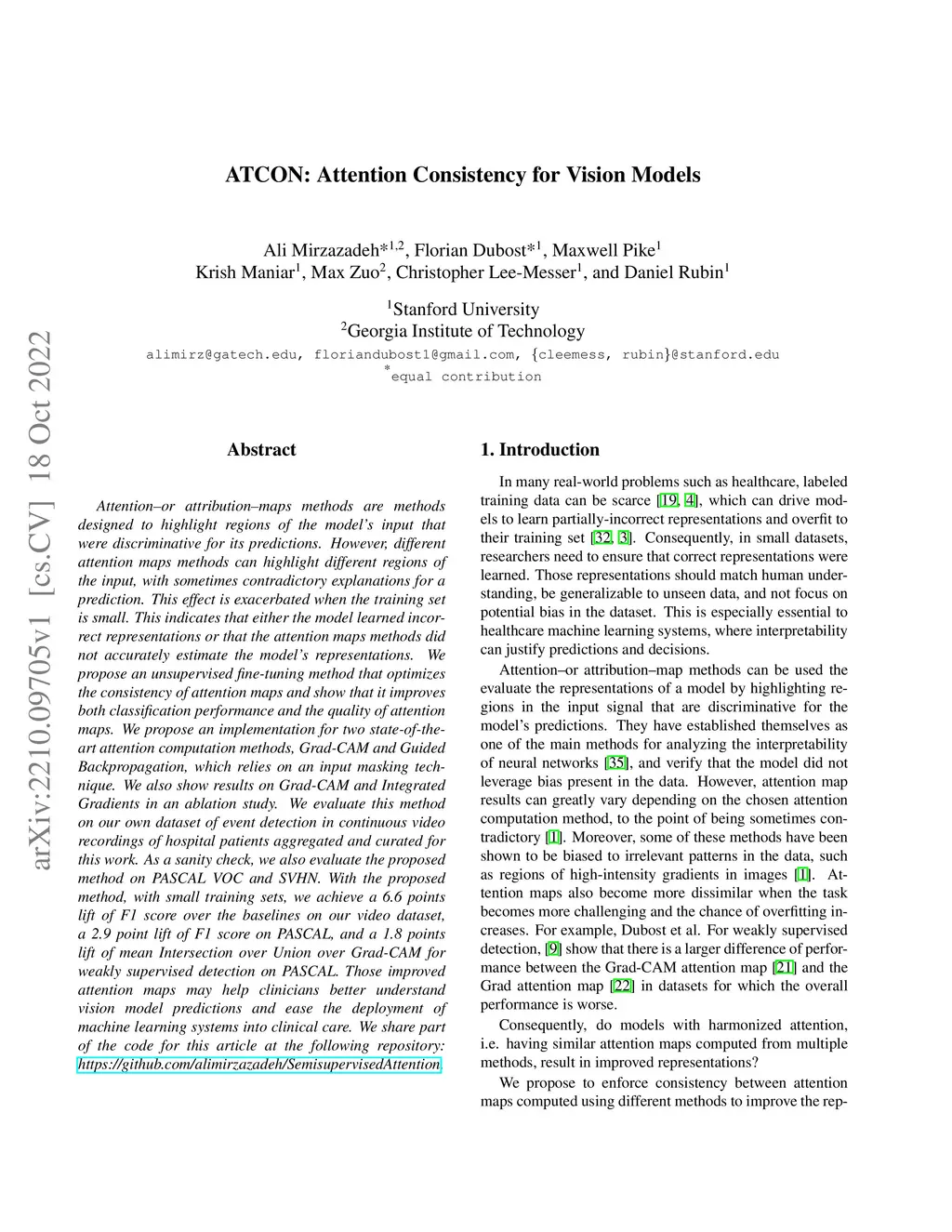 Attention--or attribution--maps methods are methods designed to highlight regions of the model's input that were discriminative for its predictions. However, different attention maps methods can highlight different regions of the input, with sometimes contradictory explanations for a prediction. This effect is exacerbated when the training set is small. This indicates that either the model learned incorrect representations or that the attention maps methods did not accurately estimate the model's representations. We propose an unsupervised fine-tuning method that optimizes the consistency of attention maps and show that it improves both classification performance and the quality of attention maps. We propose an implementation for two state-of-the-art attention computation methods, Grad-CAM and Guided Backpropagation, which relies on an input masking technique. We also show results on Grad-CAM and Integrated Gradients in an ablation study. We evaluate this method on our own dataset of event detection in continuous video recordings of hospital patients aggregated and curated for this work. As a sanity check, we also evaluate the proposed method on PASCAL VOC and SVHN. With the proposed method, with small training sets, we achieve a 6.6 points lift of F1 score over the baselines on our video dataset, a 2.9 point lift of F1 score on PASCAL, and a 1.8 points lift of mean Intersection over Union over Grad-CAM for weakly supervised detection on PASCAL. Those improved attention maps may help clinicians better understand vision model predictions and ease the deployment of machine learning systems into clinical care. We share part of the code for this article at the following repository: https://github.com/alimirzazadeh/SemisupervisedAttention.