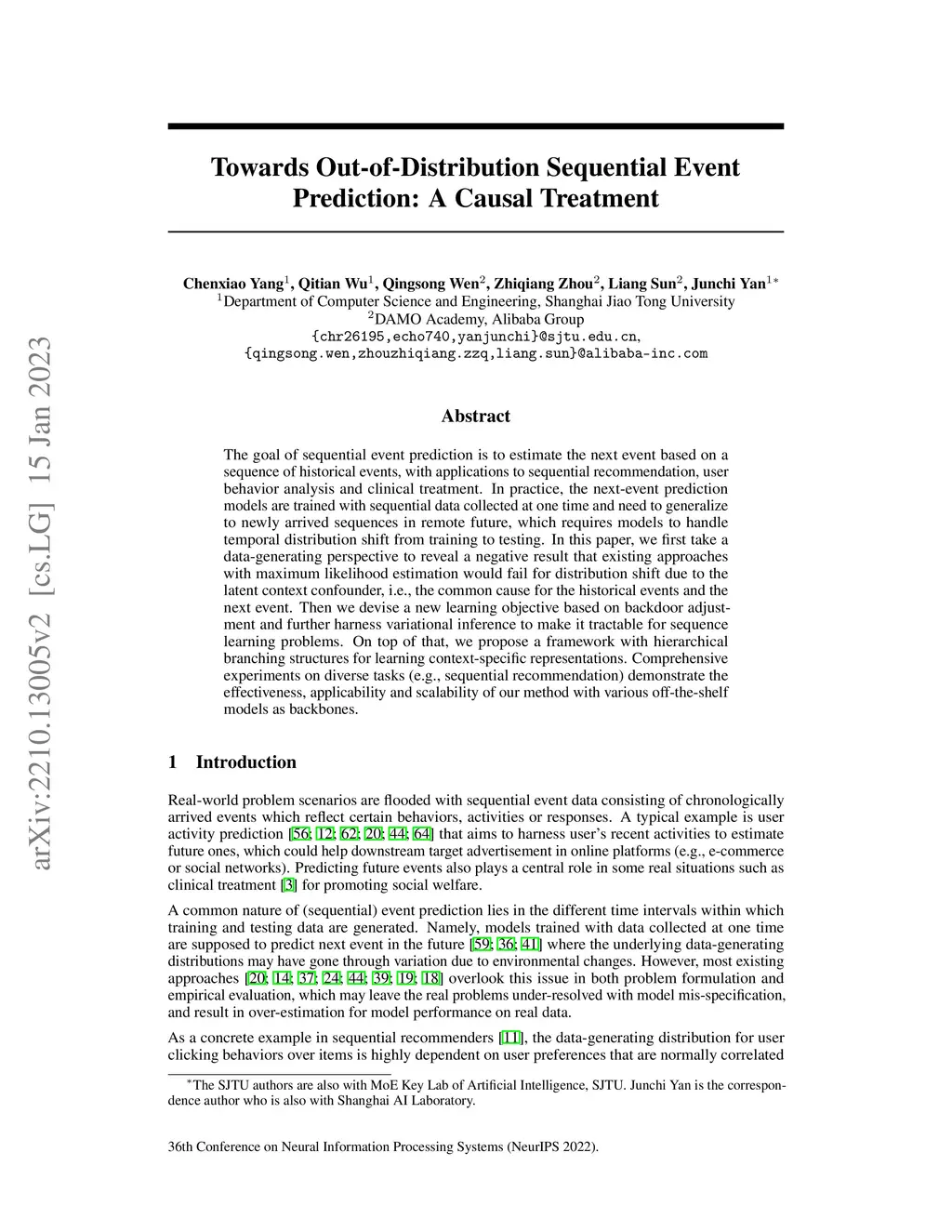 The goal of sequential event prediction is to estimate the next event based on a sequence of historical events, with applications to sequential recommendation, user behavior analysis and clinical treatment. In practice, the next-event prediction models are trained with sequential data collected at one time and need to generalize to newly arrived sequences in remote future, which requires models to handle temporal distribution shift from training to testing. In this paper, we first take a data-generating perspective to reveal a negative result that existing approaches with maximum likelihood estimation would fail for distribution shift due to the latent context confounder, i.e., the common cause for the historical events and the next event. Then we devise a new learning objective based on backdoor adjustment and further harness variational inference to make it tractable for sequence learning problems. On top of that, we propose a framework with hierarchical branching structures for learning context-specific representations. Comprehensive experiments on diverse tasks (e.g., sequential recommendation) demonstrate the effectiveness, applicability and scalability of our method with various off-the-shelf models as backbones.