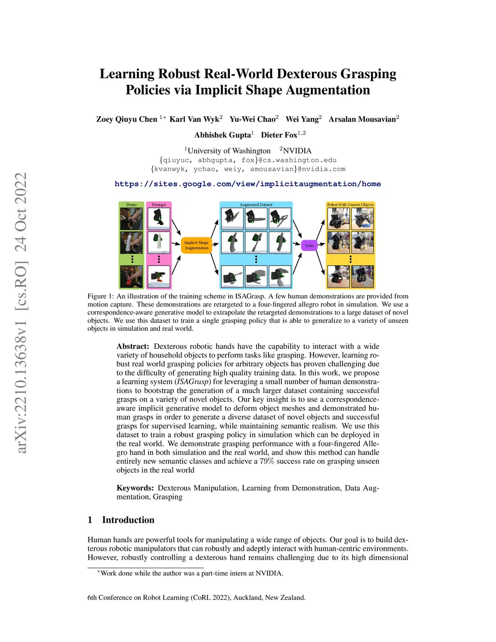 Dexterous robotic hands have the capability to interact with a wide variety of household objects to perform tasks like grasping. However, learning robust real world grasping policies for arbitrary objects has proven challenging due to the difficulty of generating high quality training data. In this work, we propose a learning system (ISAGrasp) for leveraging a small number of human demonstrations to bootstrap the generation of a much larger dataset containing successful grasps on a variety of novel objects. Our key insight is to use a correspondence-aware implicit generative model to deform object meshes and demonstrated human grasps in order to generate a diverse dataset of novel objects and successful grasps for supervised learning, while maintaining semantic realism. We use this dataset to train a robust grasping policy in simulation which can be deployed in the real world. We demonstrate grasping performance with a four-fingered Allegro hand in both simulation and the real world, and show this method can handle entirely new semantic classes and achieve a 79% success rate on grasping unseen objects in the real world.