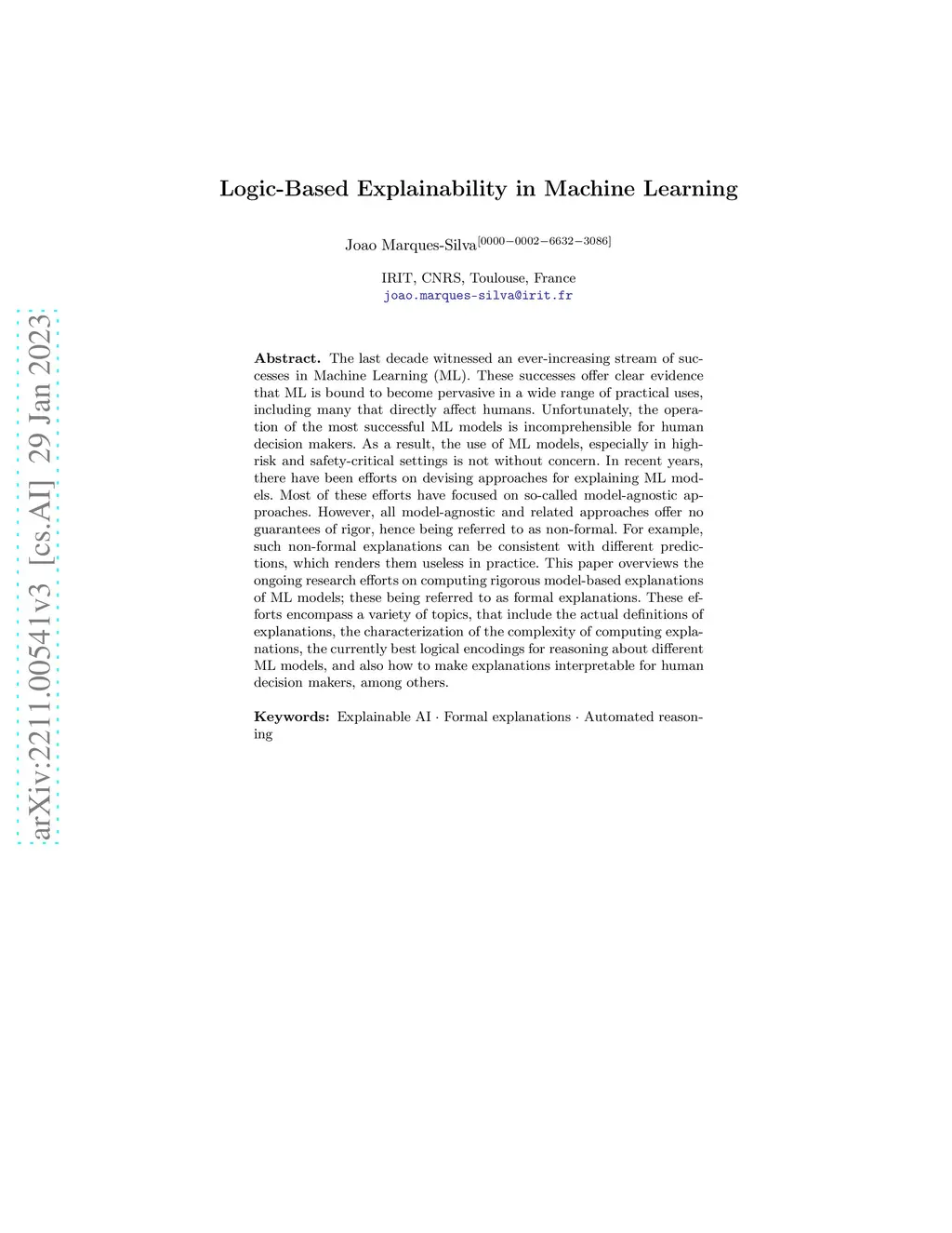 The last decade witnessed an ever-increasing stream of successes in Machine Learning (ML). These successes offer clear evidence that ML is bound to become pervasive in a wide range of practical uses, including many that directly affect humans. Unfortunately, the operation of the most successful ML models is incomprehensible for human decision makers. As a result, the use of ML models, especially in high-risk and safety-critical settings is not without concern. In recent years, there have been efforts on devising approaches for explaining ML models. Most of these efforts have focused on so-called model-agnostic approaches. However, all model-agnostic and related approaches offer no guarantees of rigor, hence being referred to as non-formal. For example, such non-formal explanations can be consistent with different predictions, which renders them useless in practice. This paper overviews the ongoing research efforts on computing rigorous model-based explanations of ML models; these being referred to as formal explanations. These efforts encompass a variety of topics, that include the actual definitions of explanations, the characterization of the complexity of computing explanations, the currently best logical encodings for reasoning about different ML models, and also how to make explanations interpretable for human decision makers, among others.