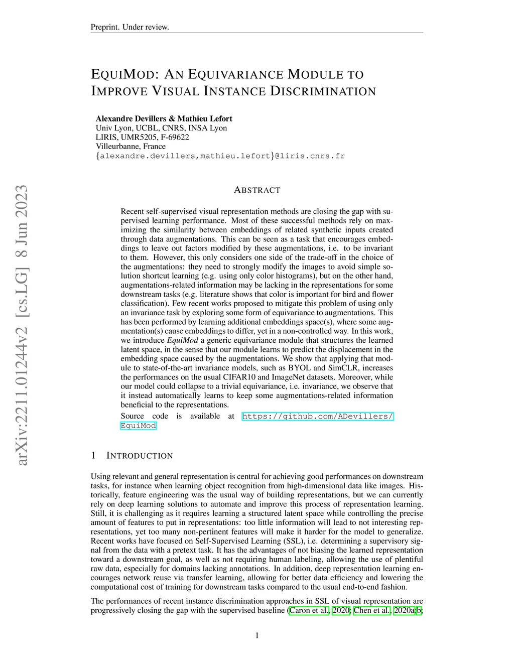 Self-supervised visual representation methods are closing the gap with supervised learning performance. These methods rely on maximizing the similarity between embeddings of related synthetic inputs created through data augmentations. This can be seen as a task that encourages embeddings to leave out factors modified by these augmentations, i.e. to be invariant to them. However, this only considers one side of the trade-off in the choice of the augmentations: they need to strongly modify the images to avoid simple solution shortcut learning (e.g. using only color histograms), but on the other hand, augmentations-related information may be lacking in the representations for some downstream tasks (e.g. color is important for birds and flower classification). Few recent works proposed to mitigate the problem of using only an invariance task by exploring some form of equivariance to augmentations. This has been performed by learning additional embeddings space(s), where some augmentation(s) cause embeddings to differ, yet in a non-controlled way. In this work, we introduce EquiMod a generic equivariance module that structures the learned latent space, in the sense that our module learns to predict the displacement in the embedding space caused by the augmentations. We show that applying that module to state-of-the-art invariance models, such as SimCLR and BYOL, increases the performances on CIFAR10 and ImageNet datasets. Moreover, while our model could collapse to a trivial equivariance, i.e. invariance, we observe that it instead automatically learns to keep some augmentations-related information beneficial to the representations.