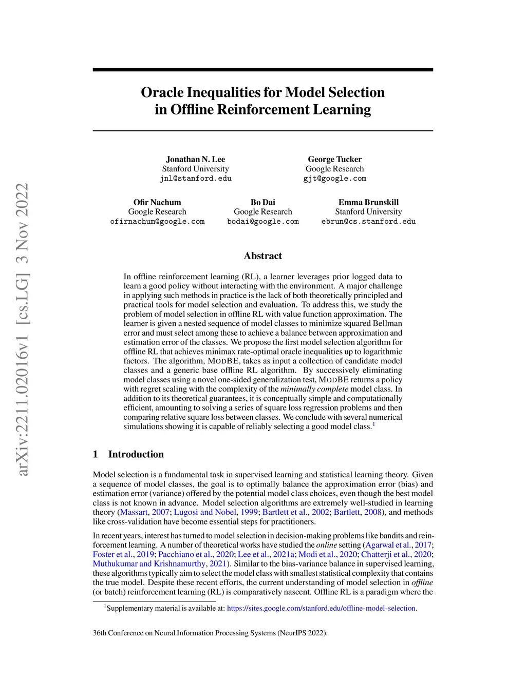 In offline reinforcement learning (RL), a learner leverages prior logged data to learn a good policy without interacting with the environment. A major challenge in applying such methods in practice is the lack of both theoretically principled and practical tools for model selection and evaluation. To address this, we study the problem of model selection in offline RL with value function approximation. The learner is given a nested sequence of model classes to minimize squared Bellman error and must select among these to achieve a balance between approximation and estimation error of the classes. We propose the first model selection algorithm for offline RL that achieves minimax rate-optimal oracle inequalities up to logarithmic factors. The algorithm, ModBE, takes as input a collection of candidate model classes and a generic base offline RL algorithm. By successively eliminating model classes using a novel one-sided generalization test, ModBE returns a policy with regret scaling with the complexity of the minimally complete model class. In addition to its theoretical guarantees, it is conceptually simple and computationally efficient, amounting to solving a series of square loss regression problems and then comparing relative square loss between classes. We conclude with several numerical simulations showing it is capable of reliably selecting a good model class.