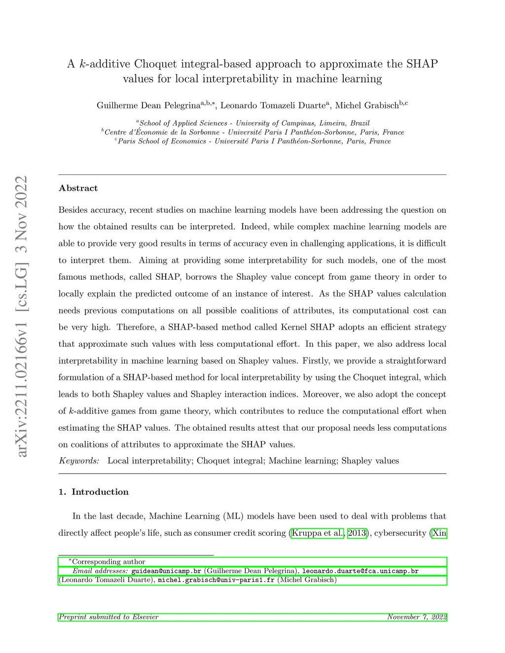 Besides accuracy, recent studies on machine learning models have been addressing the question on how the obtained results can be interpreted. Indeed, while complex machine learning models are able to provide very good results in terms of accuracy even in challenging applications, it is difficult to interpret them. Aiming at providing some interpretability for such models, one of the most famous methods, called SHAP, borrows the Shapley value concept from game theory in order to locally explain the predicted outcome of an instance of interest. As the SHAP values calculation needs previous computations on all possible coalitions of attributes, its computational cost can be very high. Therefore, a SHAP-based method called Kernel SHAP adopts an efficient strategy that approximate such values with less computational effort. In this paper, we also address local interpretability in machine learning based on Shapley values. Firstly, we provide a straightforward formulation of a SHAP-based method for local interpretability by using the Choquet integral, which leads to both Shapley values and Shapley interaction indices. Moreover, we also adopt the concept of -additive games from game theory, which contributes to reduce the computational effort when estimating the SHAP values. The obtained results attest that our proposal needs less computations on coalitions of attributes to approximate the SHAP values.