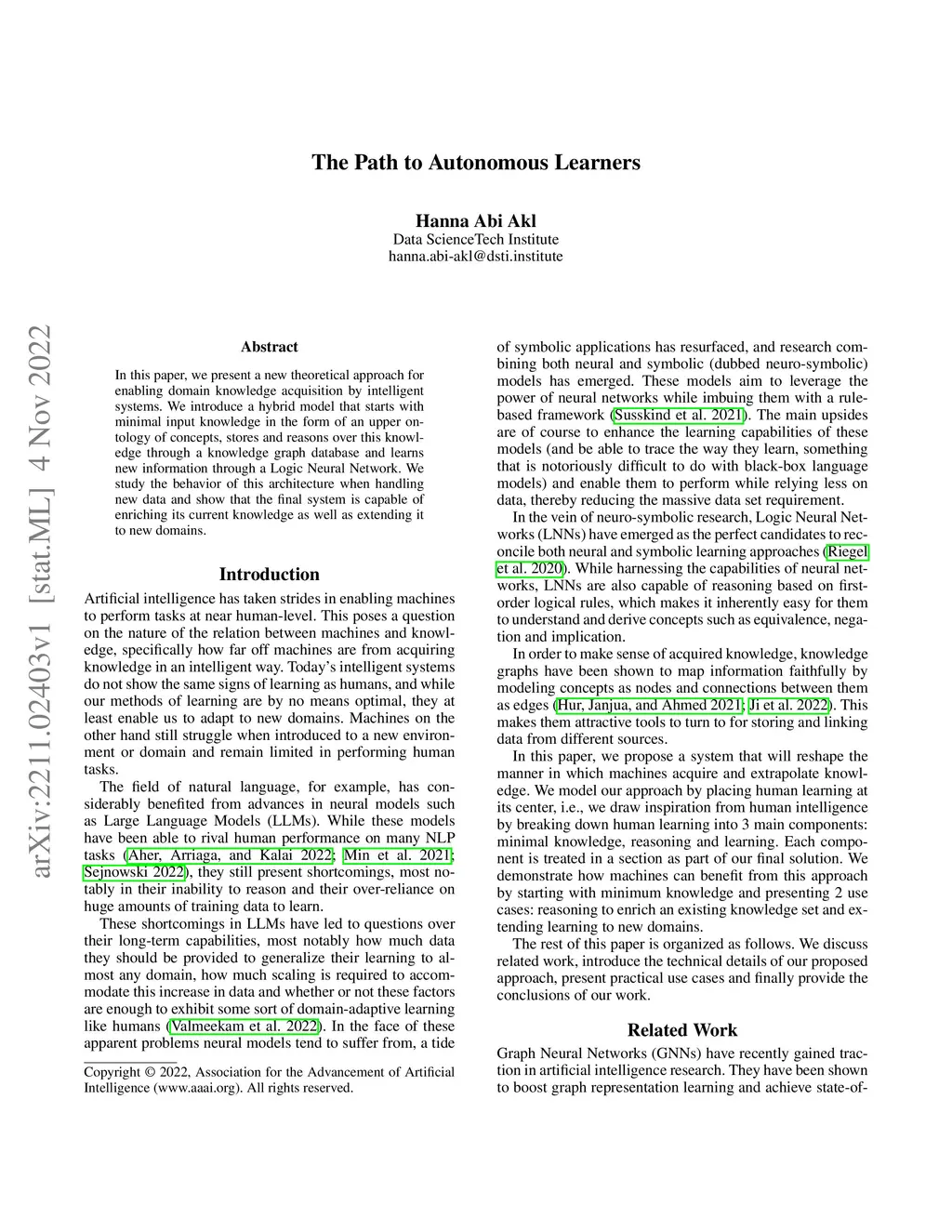 In this paper, we present a new theoretical approach for enabling domain knowledge acquisition by intelligent systems. We introduce a hybrid model that starts with minimal input knowledge in the form of an upper ontology of concepts, stores and reasons over this knowledge through a knowledge graph database and learns new information through a Logic Neural Network. We study the behavior of this architecture when handling new data and show that the final system is capable of enriching its current knowledge as well as extending it to new domains.