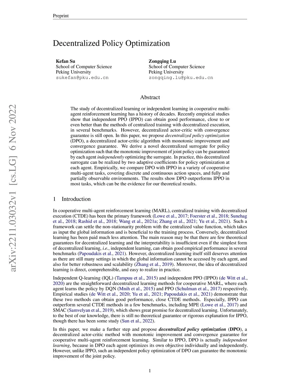Decentralized Policy Optimization