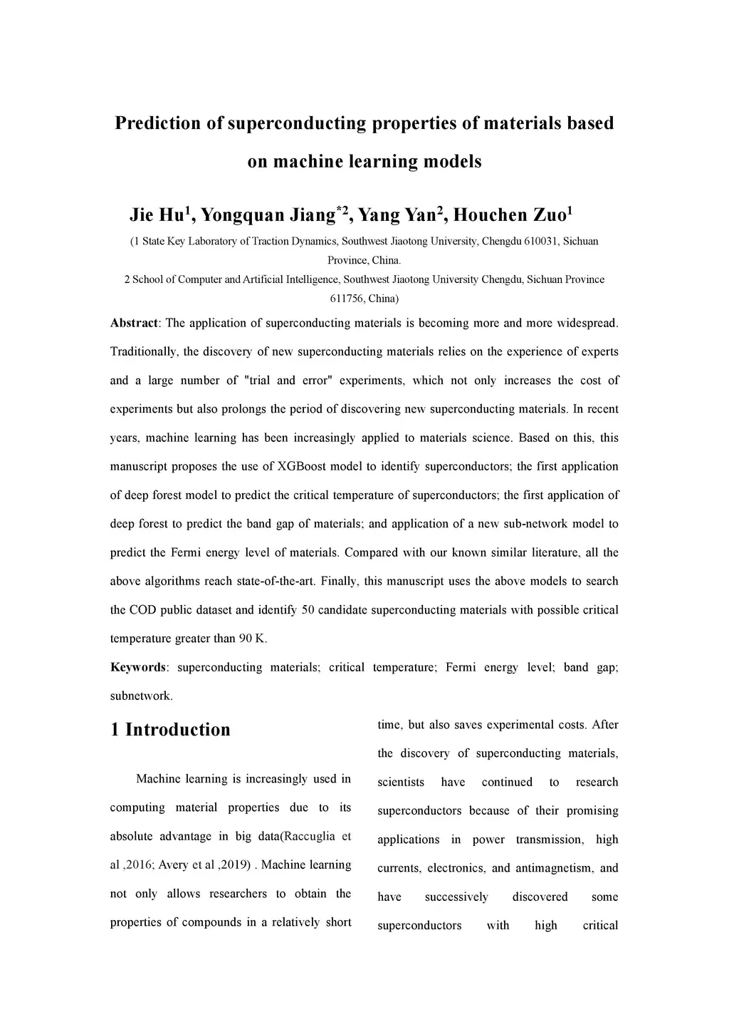 The application of superconducting materials is becoming more and more widespread. Traditionally, the discovery of new superconducting materials relies on the experience of experts and a large number of "trial and error" experiments, which not only increases the cost of experiments but also prolongs the period of discovering new superconducting materials. In recent years, machine learning has been increasingly applied to materials science. Based on this, this manuscript proposes the use of XGBoost model to identify superconductors; the first application of deep forest model to predict the critical temperature of superconductors; the first application of deep forest to predict the band gap of materials; and application of a new sub-network model to predict the Fermi energy level of materials. Compared with our known similar literature, all the above algorithms reach state-of-the-art. Finally, this manuscript uses the above models to search the COD public dataset and identify 50 candidate superconducting materials with possible critical temperature greater than 90 K.