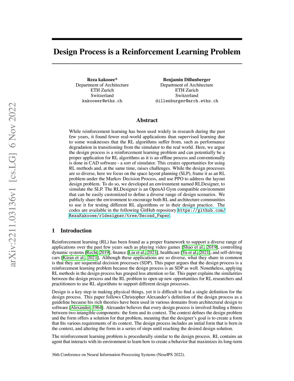 While reinforcement learning has been used widely in research during the past few years, it found fewer real-world applications than supervised learning due to some weaknesses that the RL algorithms suffer from, such as performance degradation in transitioning from the simulator to the real world. Here, we argue the design process is a reinforcement learning problem and can potentially be a proper application for RL algorithms as it is an offline process and conventionally is done in CAD software - a sort of simulator. This creates opportunities for using RL methods and, at the same time, raises challenges. While the design processes are so diverse, here we focus on the space layout planning (SLP), frame it as an RL problem under the Markov Decision Process, and use PPO to address the layout design problem. To do so, we developed an environment named RLDesigner, to simulate the SLP. The RLDesigner is an OpenAI Gym compatible environment that can be easily customized to define a diverse range of design scenarios. We publicly share the environment to encourage both RL and architecture communities to use it for testing different RL algorithms or in their design practice. The codes are available in the following GitHub repository https://github.com/ RezaKakooee/rldesigner/tree/Second_Paper